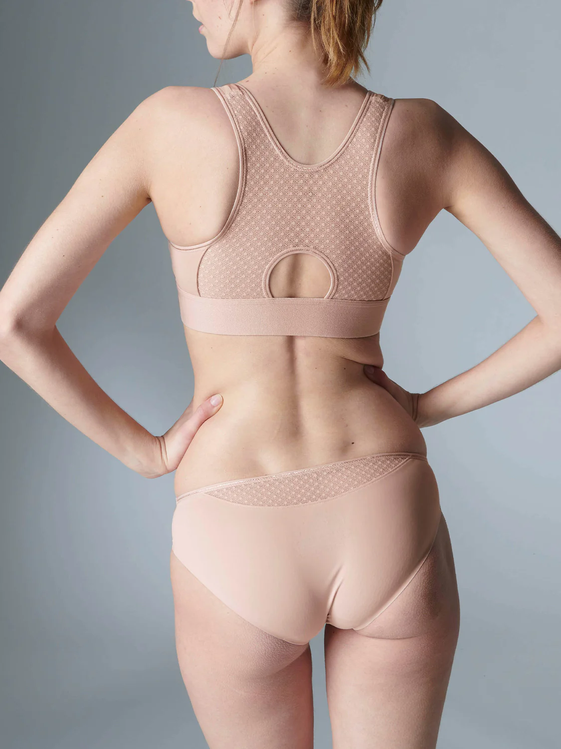 Ligne sport qui conjugue style et technicité.Un look féminin sans faire de concession sur le maintien ! Brassière de sport en maille et dentelle sans armatures. • Confort optimal.• Maintien medium. • Maille nerveuse et respirante. • Coques amovibles.• Large élastique sous poitrine en maille absorbante.• Larges bretelles.• Dos nageur tout en dentelle pour plus […]