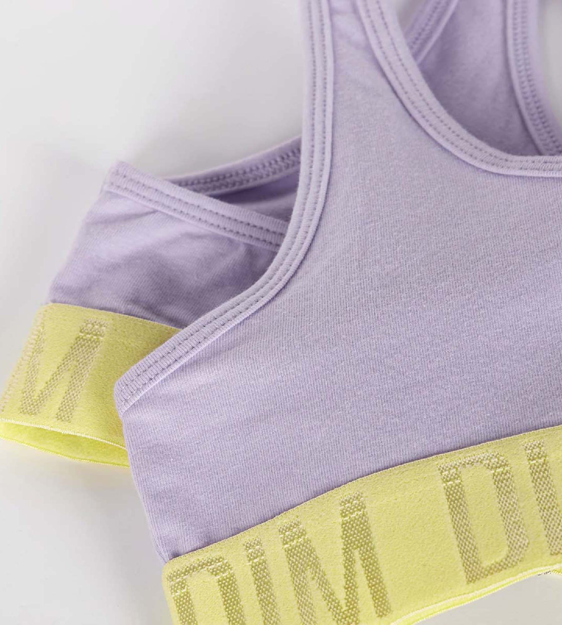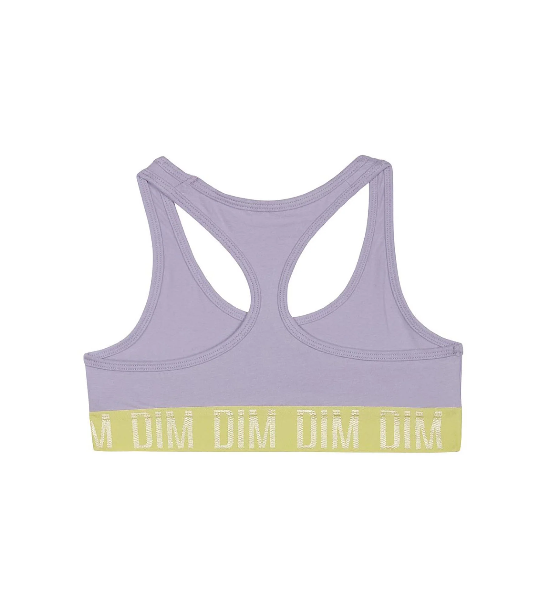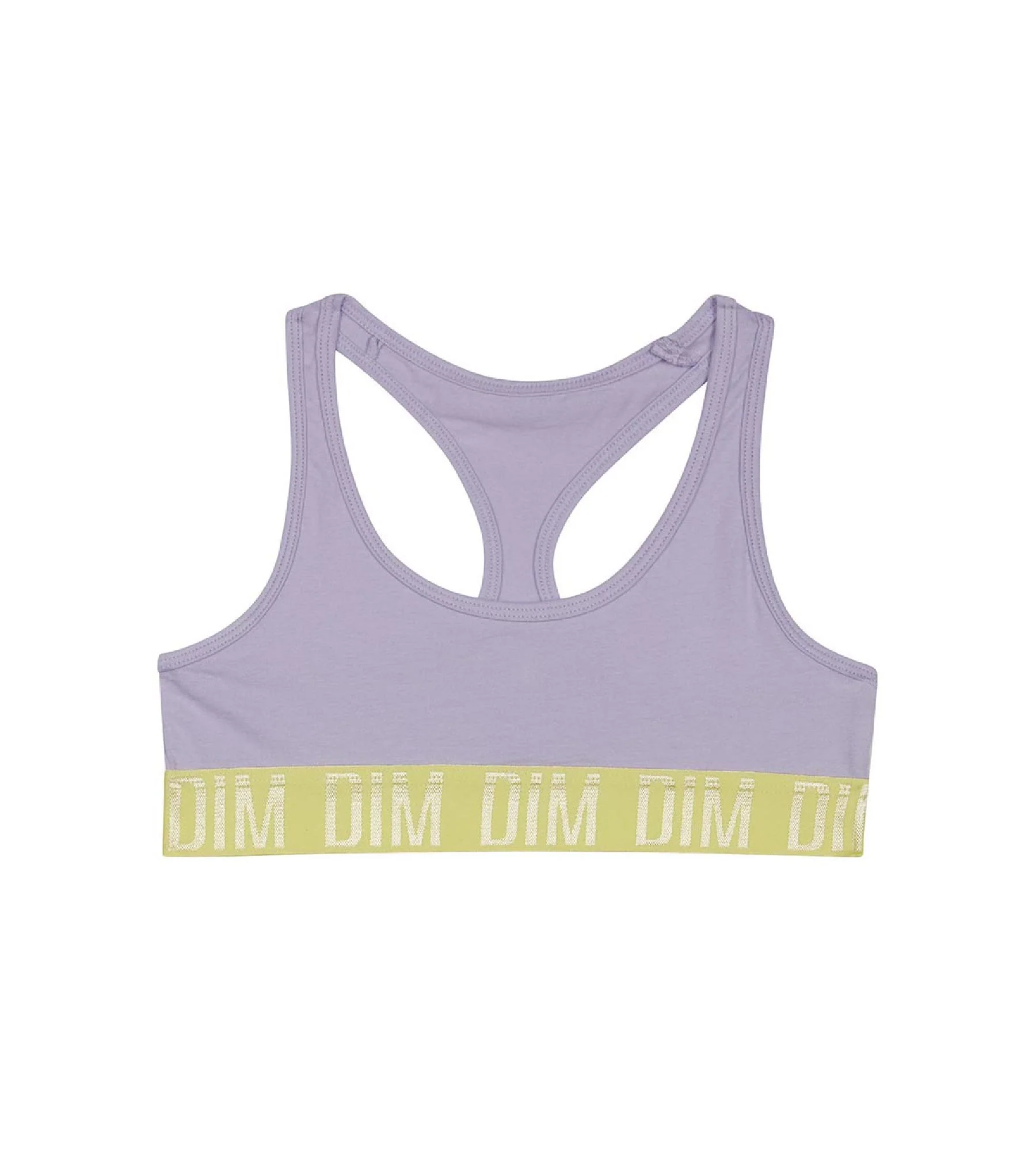 Votre ado aborde sa pratique avec énergie et féminité grâce à sa brassière fille en coton stretch Dim Sport aux nuances Lila et Anis super fraiches !