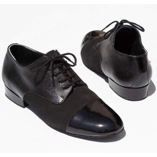 Chaussure de danse homme de la marque Magic Feet, 3 matières : vernis, velours et cuir grainé Matière : vernis, nubuck, cuir – semelle extérieure en buffle Couleur : noir Hauteur talon : 2,5 cm Pointures : 39 – 46, avec 1/2 pointures