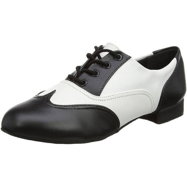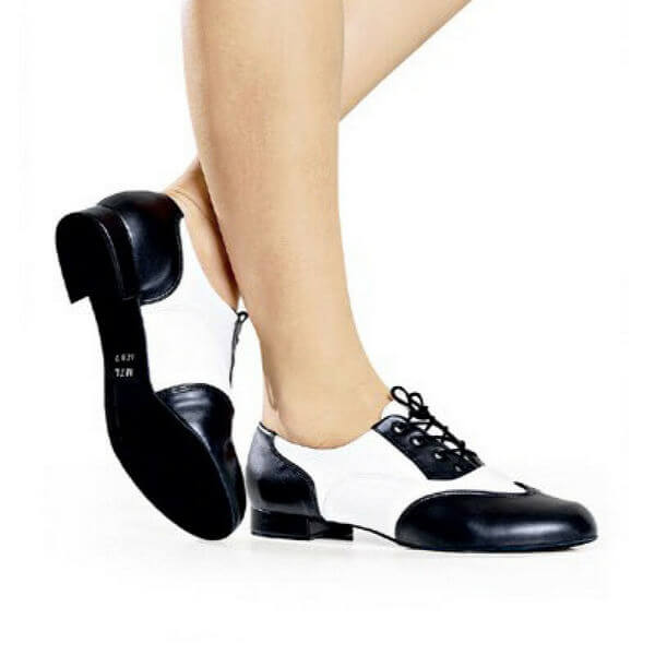 Chaussures de danse à lacets de la marque So Danca pour femme et homme, idéales pour la pratique du Moderne & Jazz Matière : cuir synthétique Couleur : noir/blanc Hauteur talon : 2 cm Pointures : 35 – 44, avec 1/2 pointures