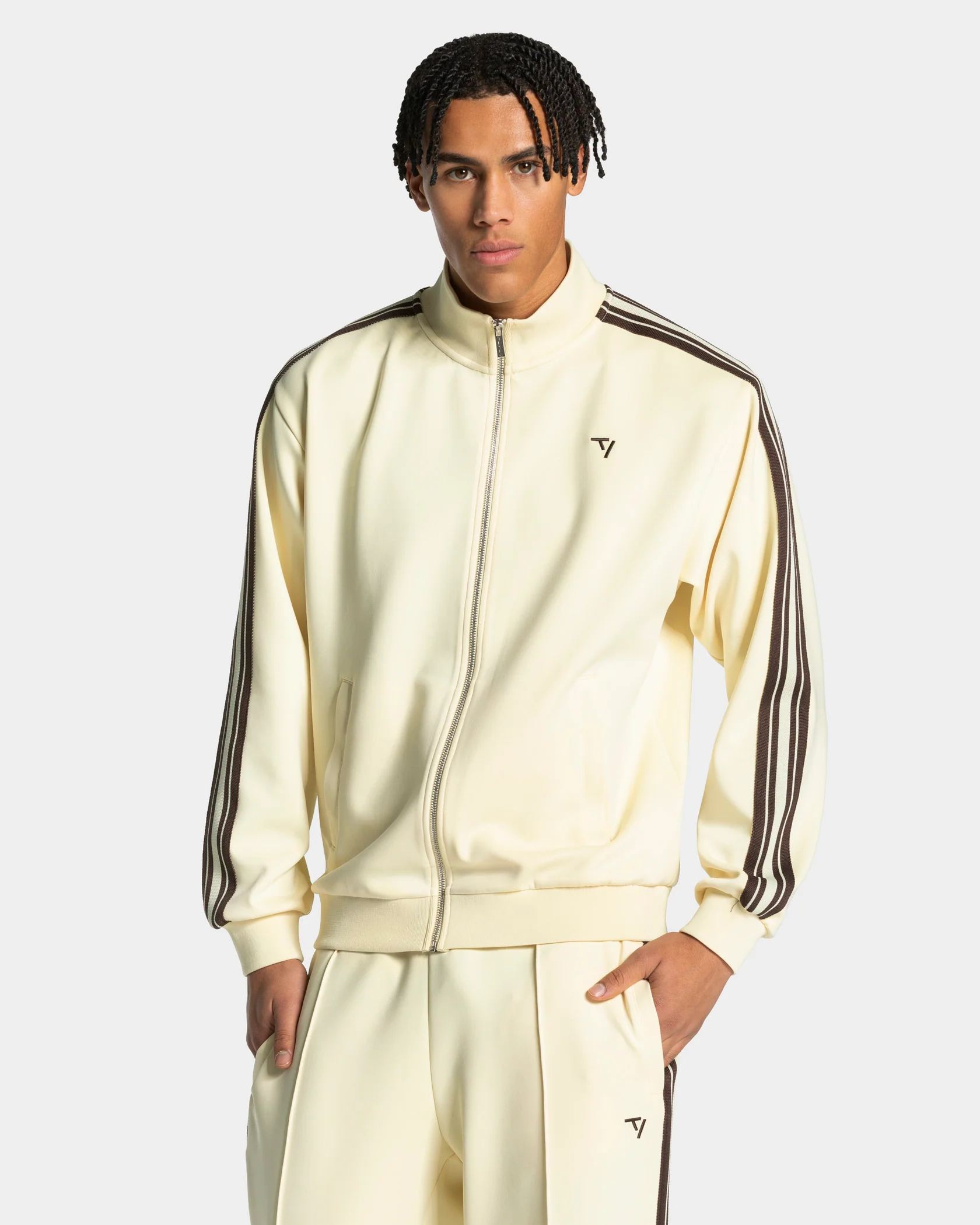 Der Regular Fit der Club Zip Jacket in Butter Yellow trifft auf klassische Details: gestrickter Stehkragen, markante Kontrast-Streifen an Ärmeln und Schultern. Tonale Reißverschlusstaschen mit Staydown Puller verstauen deine Essentials sicher, während das gestickte TV Kontrast-Logo auf der Brust und das innenliegende TEVEO Logo-Necktape den Look komplettieren.