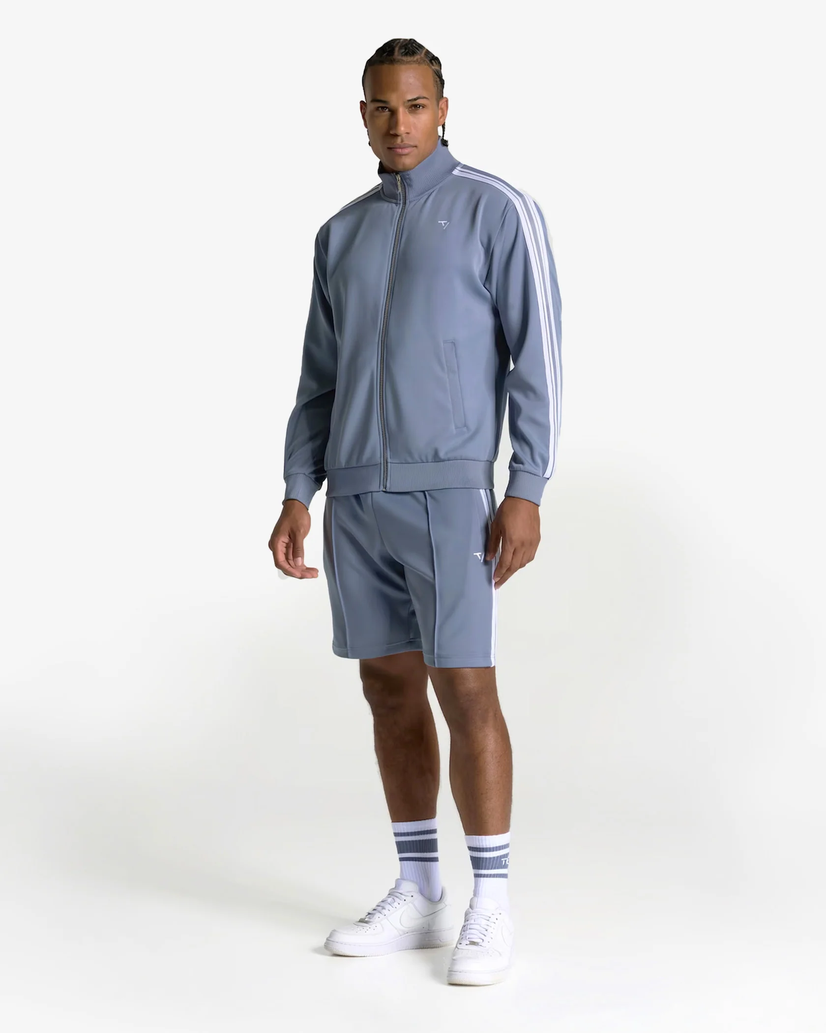 Der Regular Fit der Club Zip Jacket in Stahlblau trifft auf klassische Details: gestrickter Stehkragen, markante Kontrast-Streifen an Ärmeln und Schultern. Tonale Reißverschlusstaschen mit Staydown Puller verstauen deine Essentials sicher, während das gestickte TV Kontrast-Logo auf der Brust und das innenliegende TEVEO Logo-Necktape den Look komplettieren.