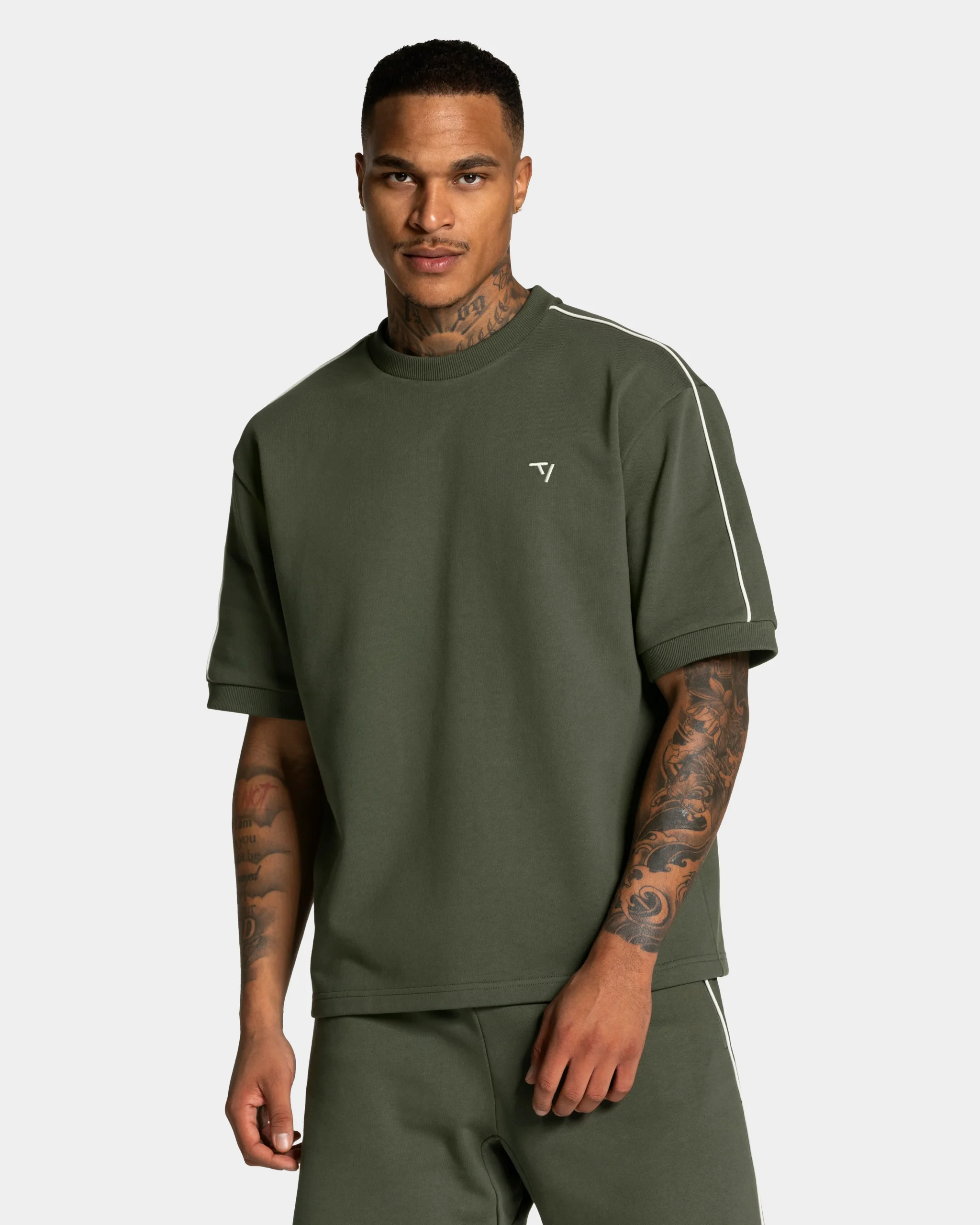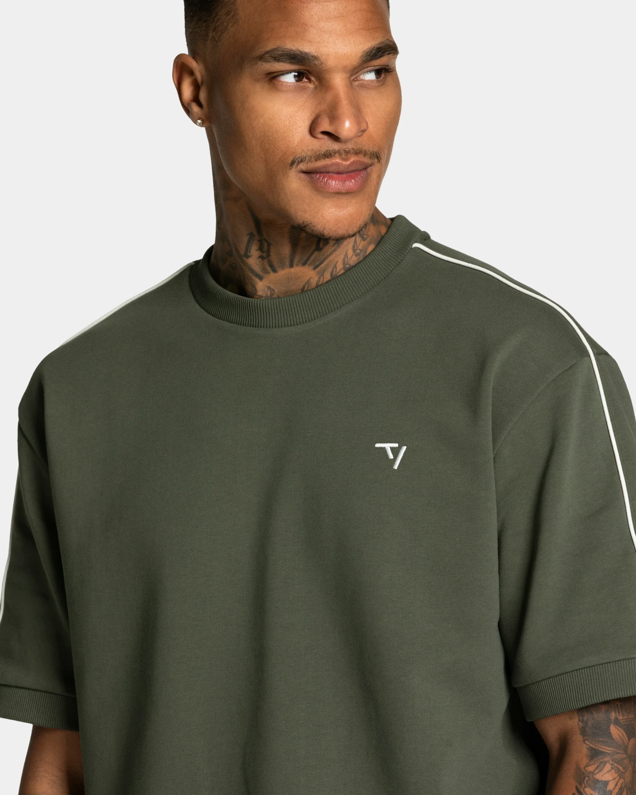 Lockere Passform trifft auf markante Details: Das Contrastline Oversized T-Shirt in Khaki kombiniert einen lässigen Oversized Fit mit kontraststarken Highlights. Dezente Pipings und das gestickte TV Markenlogo setzen stilvolle Akzente, während der Rundhalsausschnitt und die Ärmelabschlüsse mit Rippstruktur den Look vervollständigen.