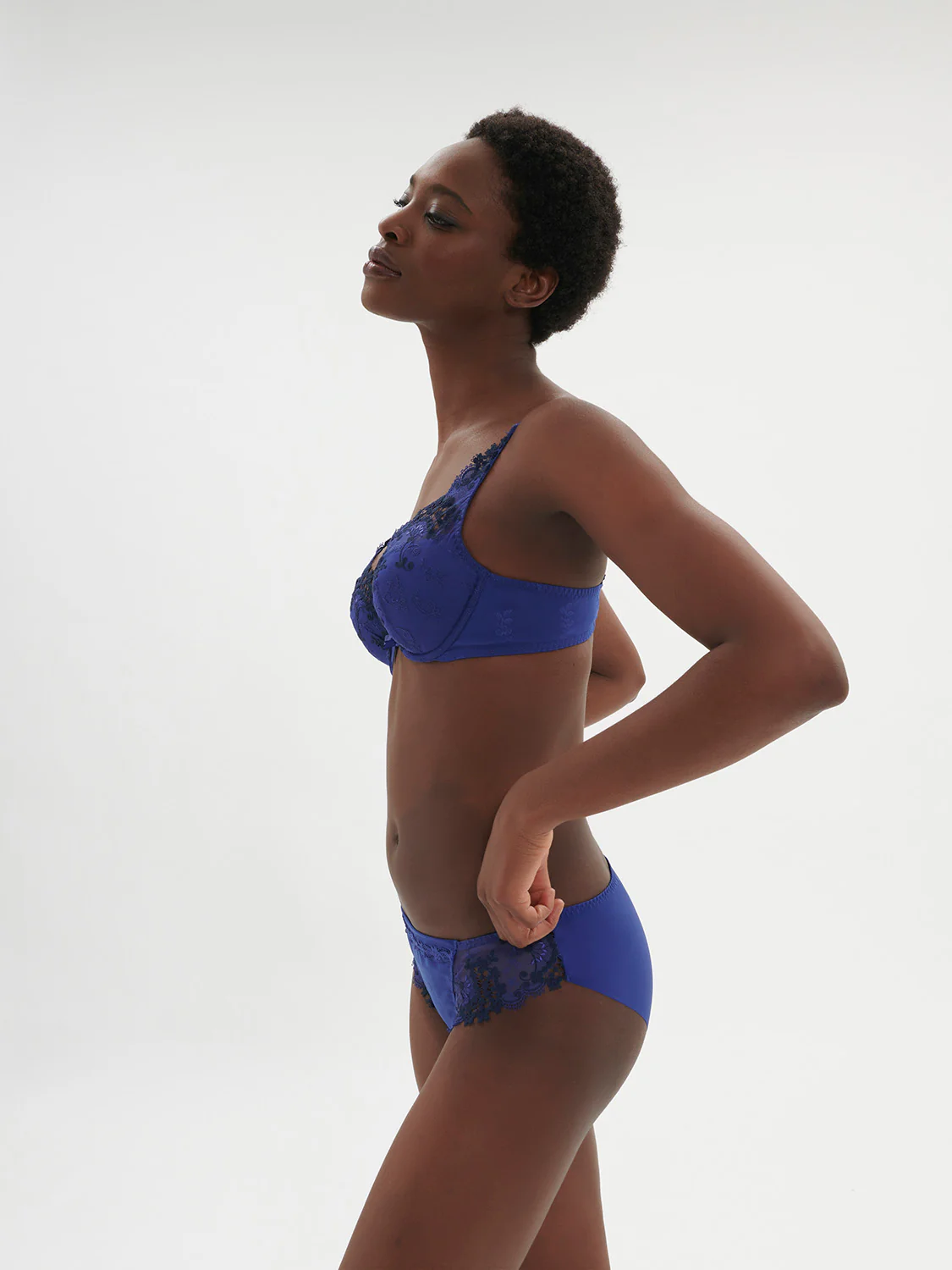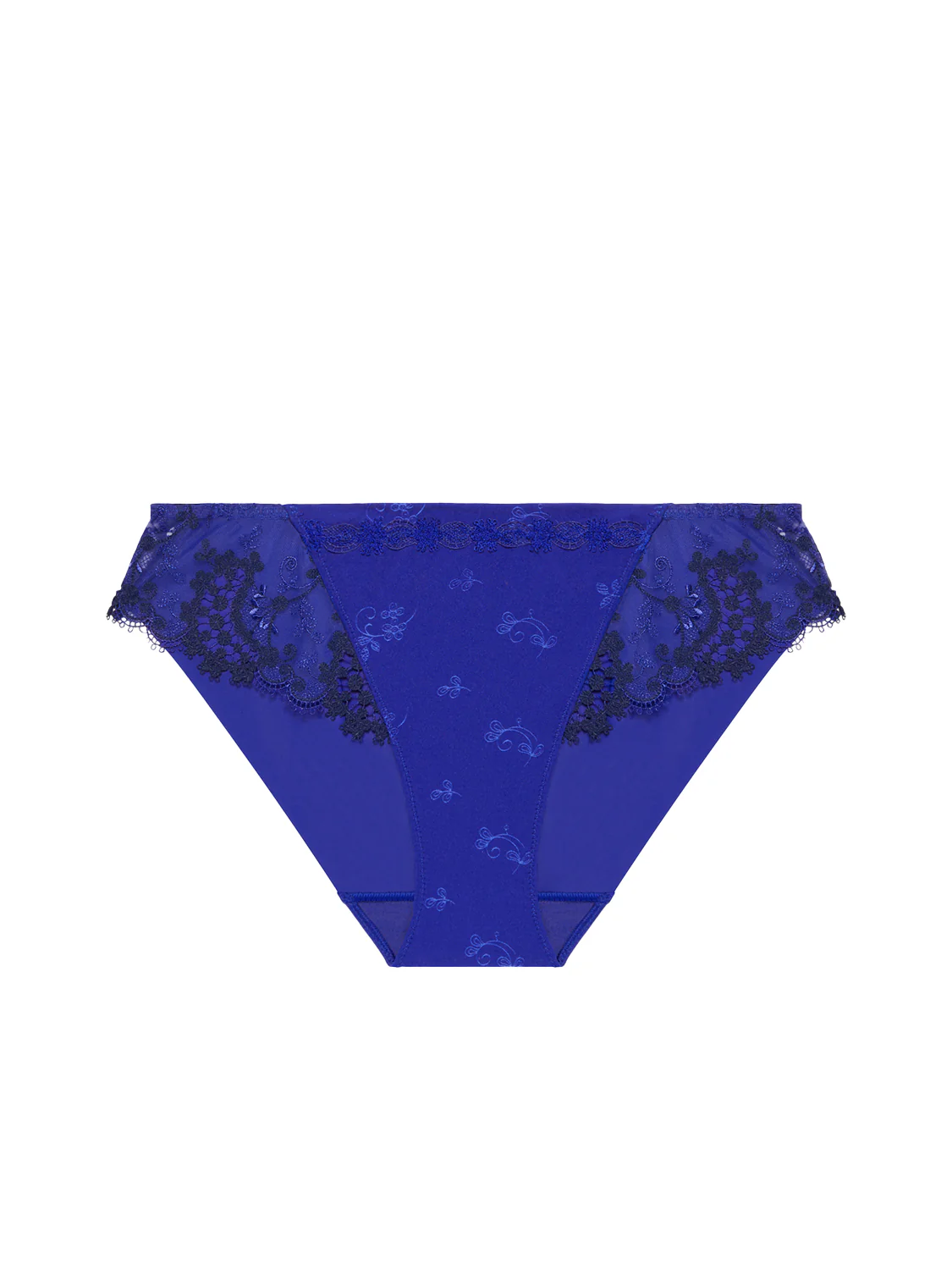 Ligne délicate en broderie florale et guipure. Raffinée et sophistiquée. Culotte en broderie, guipure et satin Jacquard. • Satin opaque sur le milieu devant pour plus d’opacité. • Dos en maille finitions clean cut sans coutures pour un porter invisible. • Fond doublé 100% coton. Référence : 12B720.530