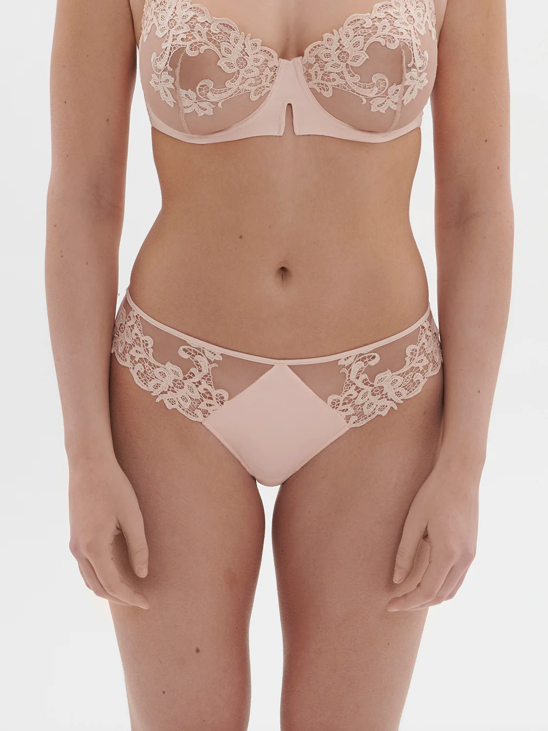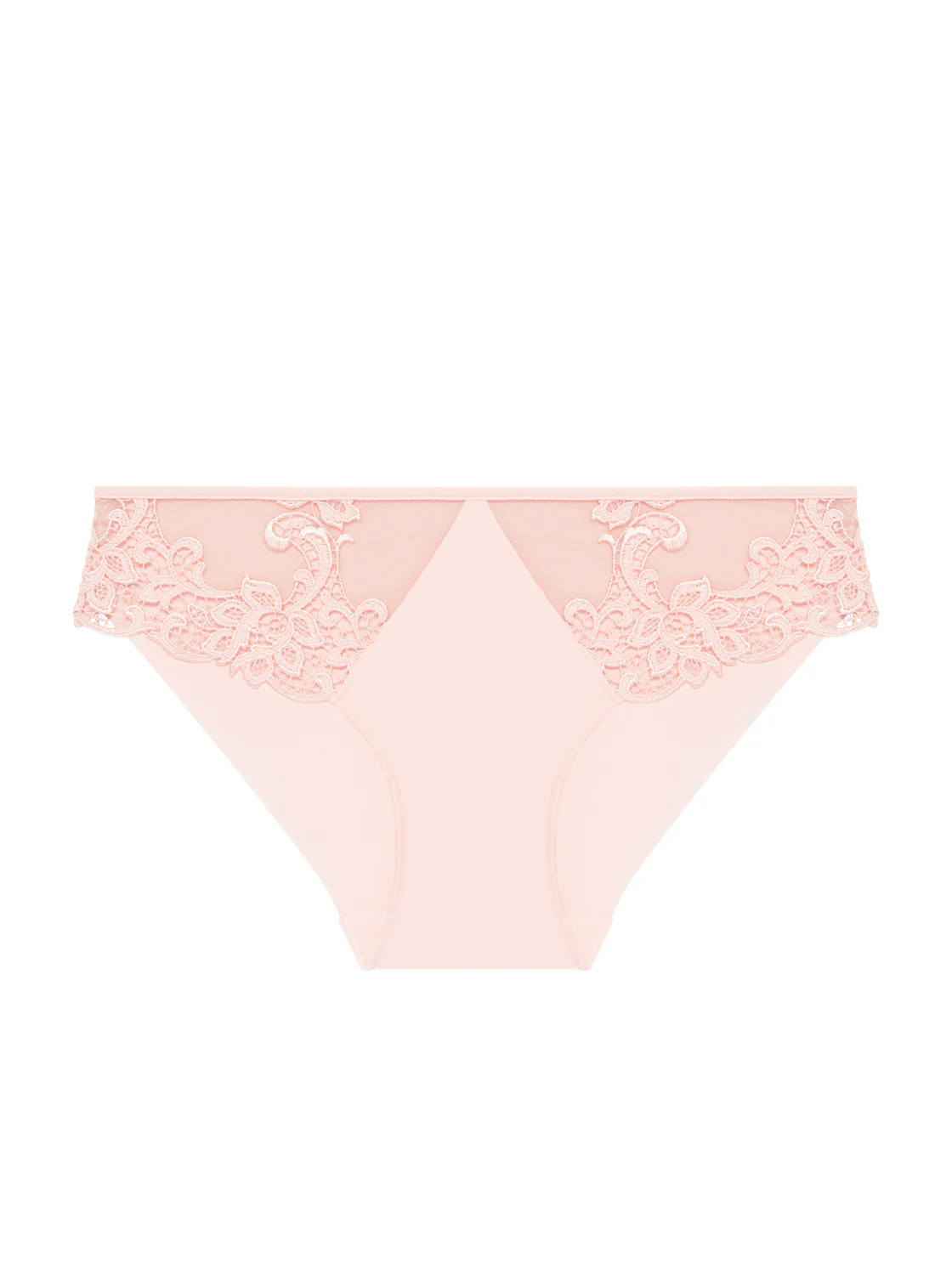 Ligne élégante où broderie et guipure se mêlent à la légèreté du tulle. Glamour et raffinée. Culotte en broderie guipure et maille. • Dos en maille opaque finitions clean cut sans coutures pour un porter invisible. • Fond 100% coton. Référence : 15C720.448