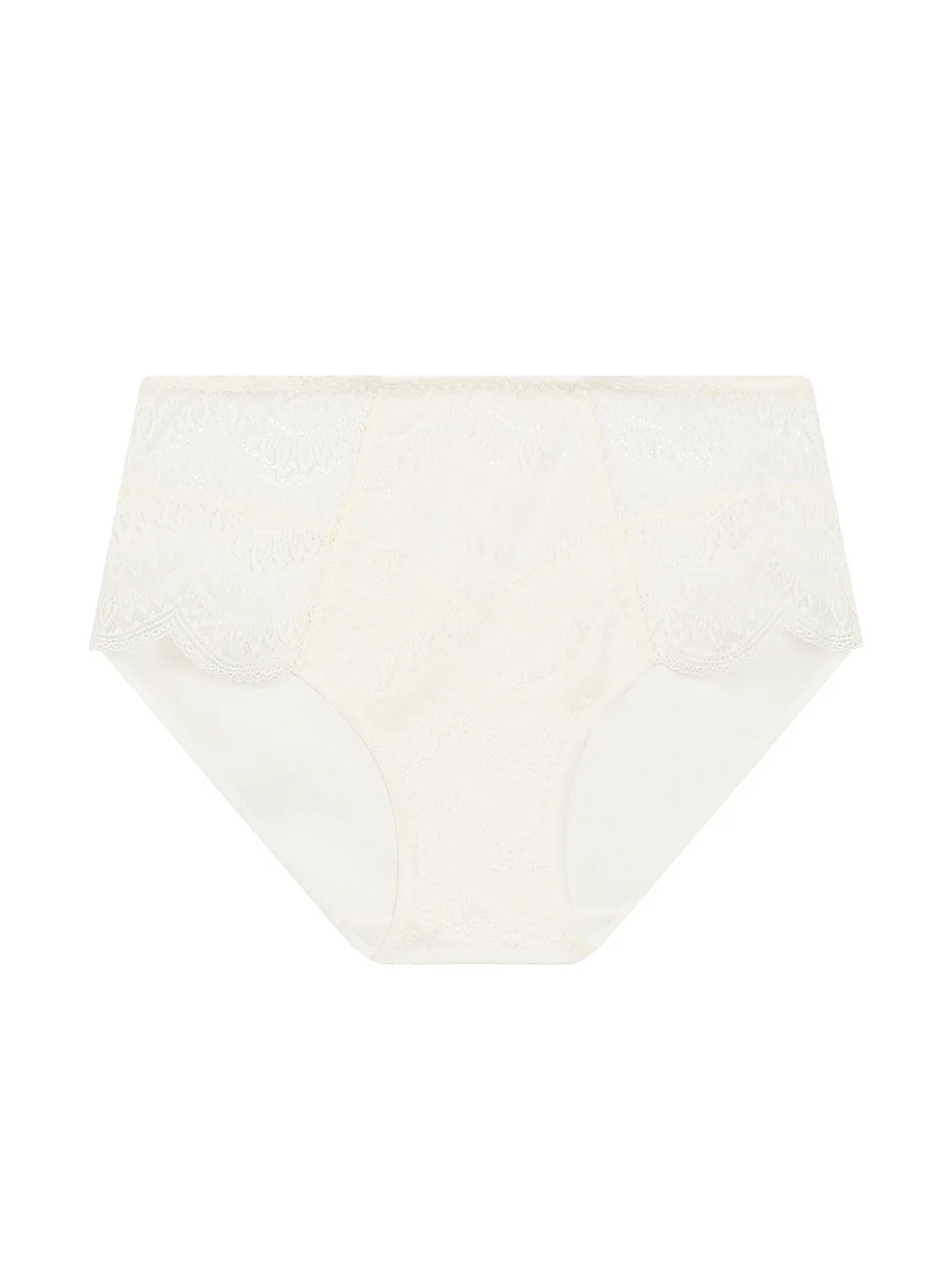 Ligne quotidienne en dentelle à festons. Féminine et intemporelle. Culotte taille haute en dentelle, coton et maille. • Devant en dentelle doublé coton pour plus de confort et d’opacité.• Dos en maille opaque Référence : 12V770.030