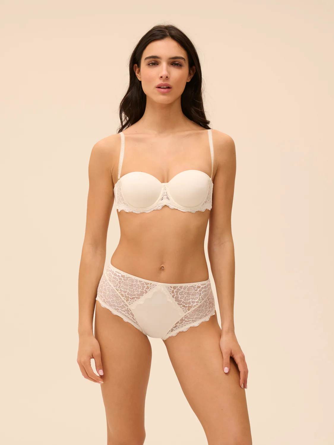 La fraîcheur de la dentelle florale et la douceur de la maille font de Caresse un incontournable. Quotidienne et intemporelle.