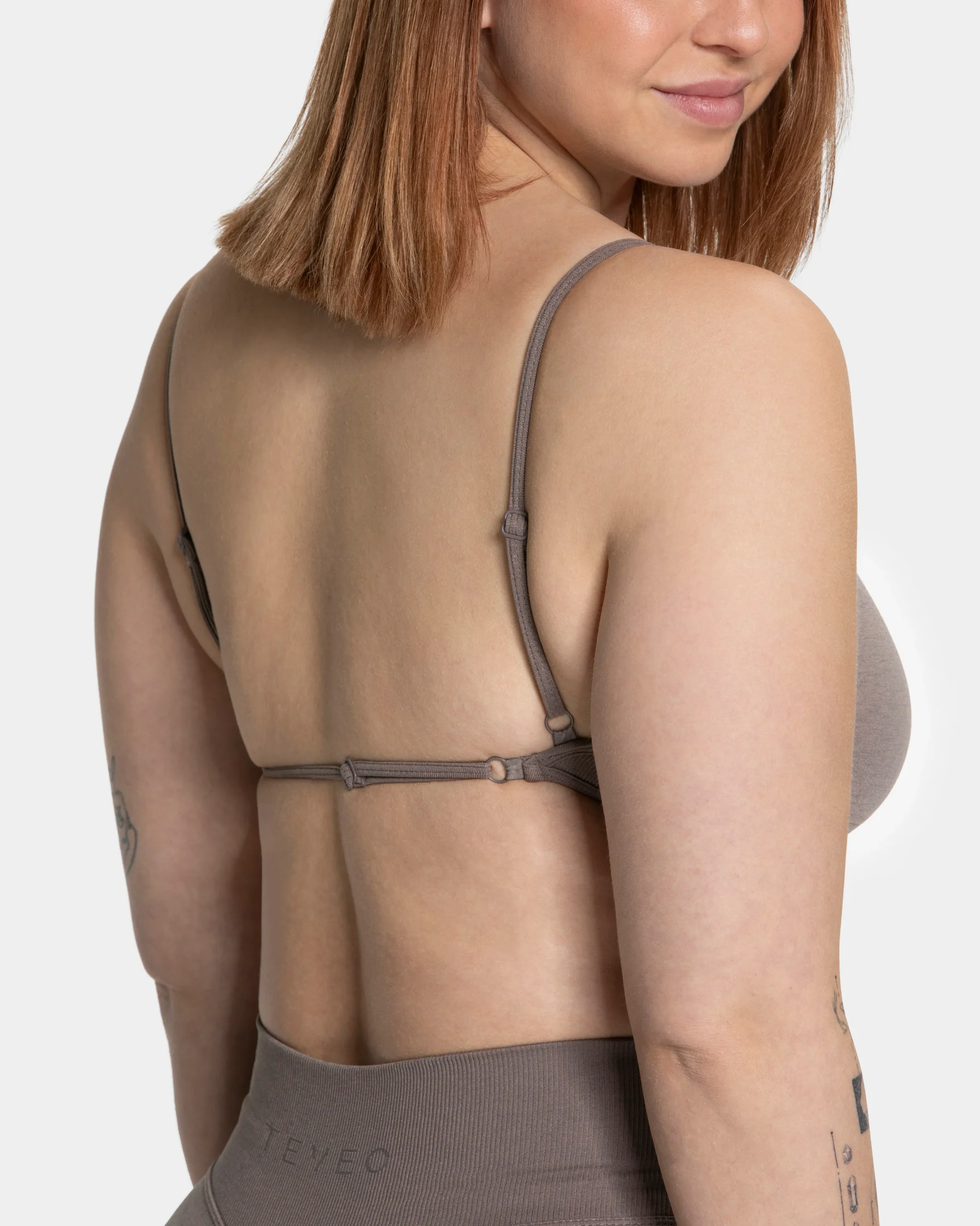 Der Femme Backless BH in Mokka ist kurz geschnitten und überzeugt vorne mit seinem schlichten Design sowie einem Ton-in-Ton TEVEO Logo. Der Rücken kommt durch den freien Ausschnitt mit dezenten Trägern wunderschön zur Geltung. Dank der verstellbaren Träger lässt er sich außerdem individuell anpassen.