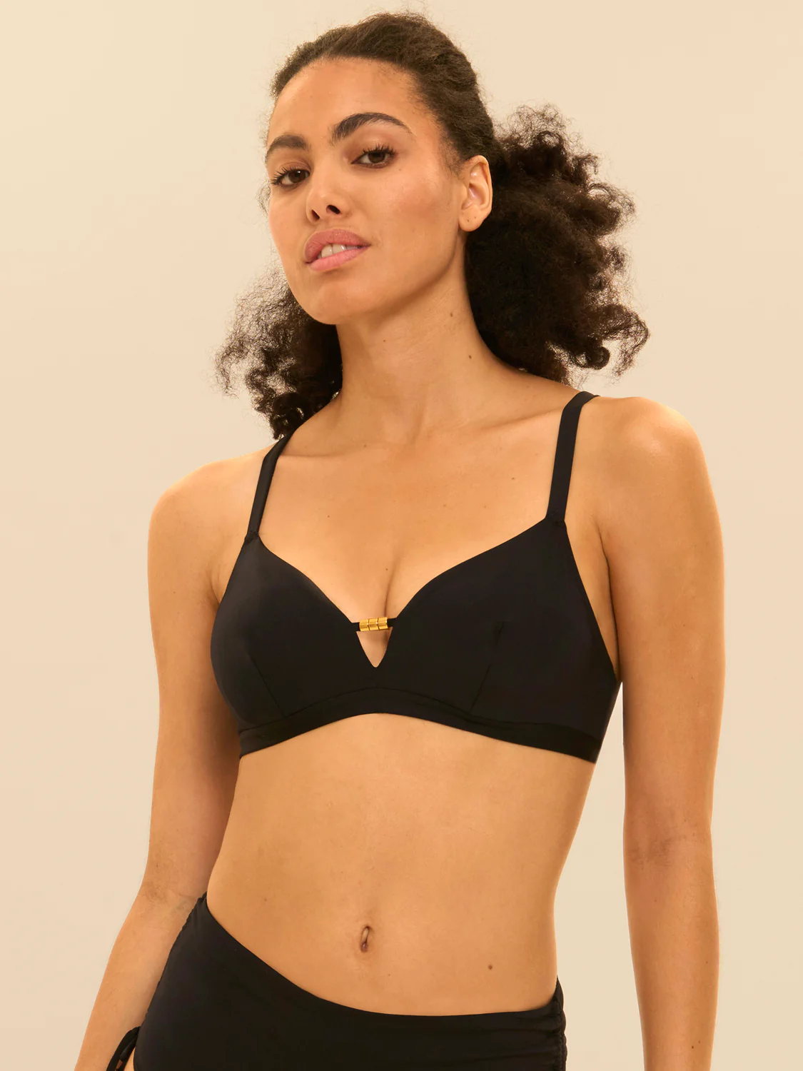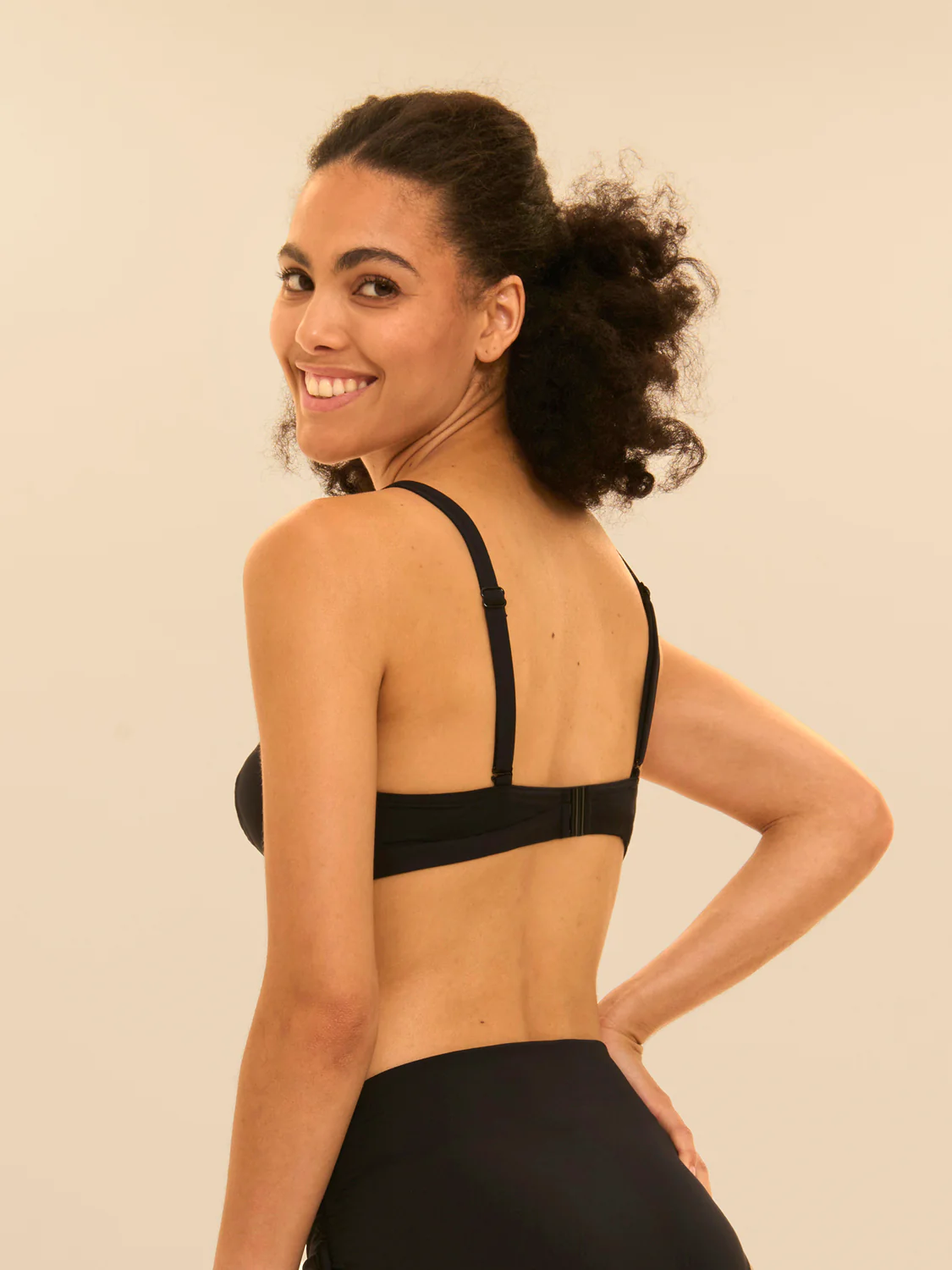 Haut de maillot de bain push-up avec armatures. • Forme triangle• Idéal pour un décolleté sublimé.• Détail perles au séparateur.• Bonnets à pinces.• Avec armatures, avec coques mousse.• A nouer autour du coup. Le + : Cette ligne fait partie de notre programme SIMONE CARES, avec une maille contenant au moins 49,8% de fibres recyclées […]
