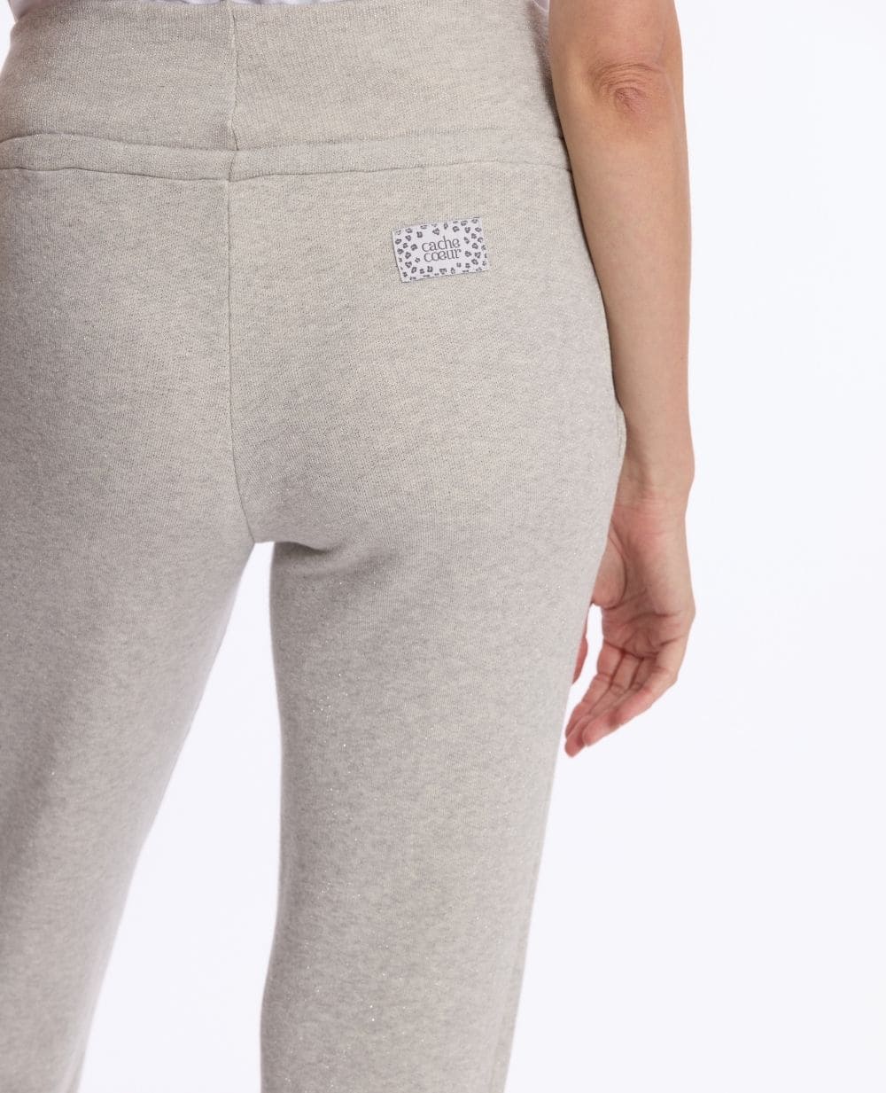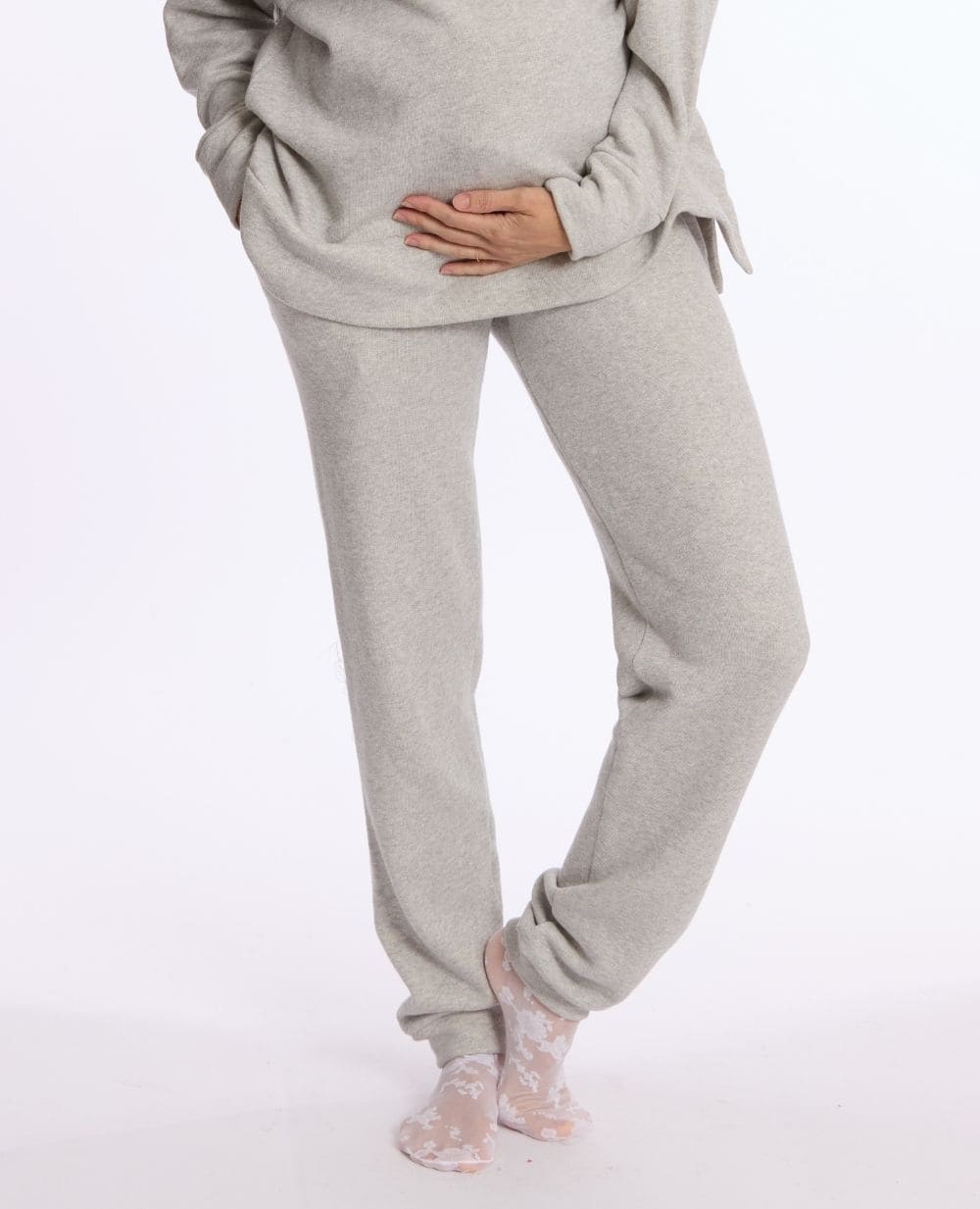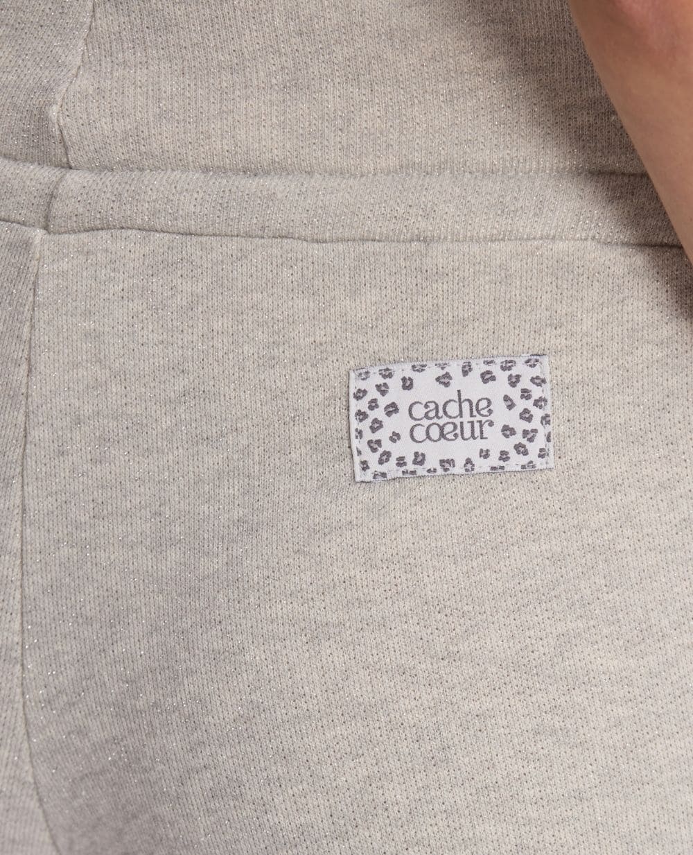 Le jogging de maternité Billie Gris allie confort et style grâce à sa matière pailletée en coton biologique et sa coupe jogger.