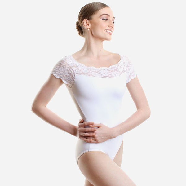 Justaucorps manche courte de danse pour femme, avec dentelle à l’encolure et sur les épaules. Couleurs disponibles : blanc, noir, rouge Matière : 90% polyamide, 10% élasthanne Couleurs : blanc, noir, rouge Tailles : 3/P, 4/S, 5/M, 6/L, 7/XL