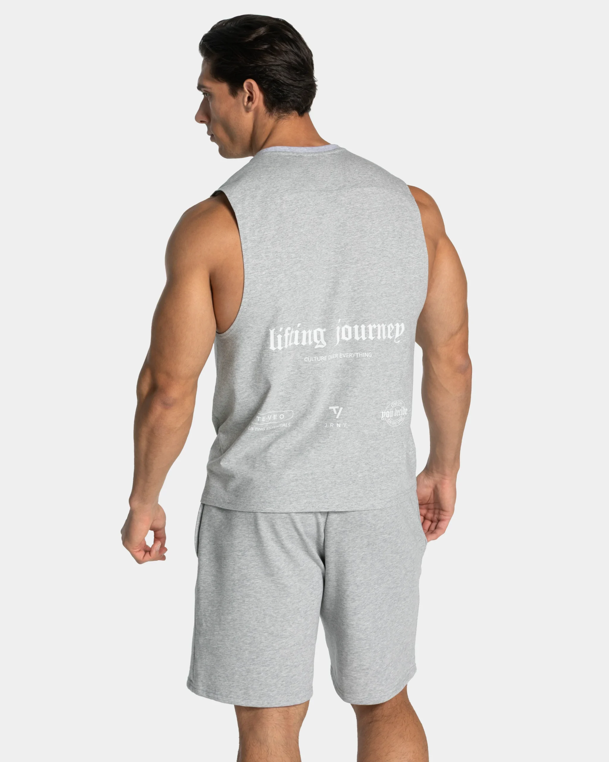 Das Lifting Journey Tank sorgt mit seinem Oversized Fit, den weiten Armausschnitten und den vorverlegten Nähten dafür, dass deine Muskeln richtig zur Geltung kommen. Das Design spricht die Sprache echter Dedication: Auf der Vorderseite überzeugt das TEVEO Lifting Journey Logo als klares Statement. Der Backprint setzt mit dem großflächigen Artwork ein kraftvolles Zeichen und wird durch drei charakteristische Prints am Saum abgerundet: TV Journey, TEVEO Lifting Essentials und « One Day or Day One – You Decide » – ein Mindset, das die gesamte Kollektion prägt. Das innenliegende TEVEO Logo-Necktape sowie die Passe auf der Rückseite runden den Look ab.
