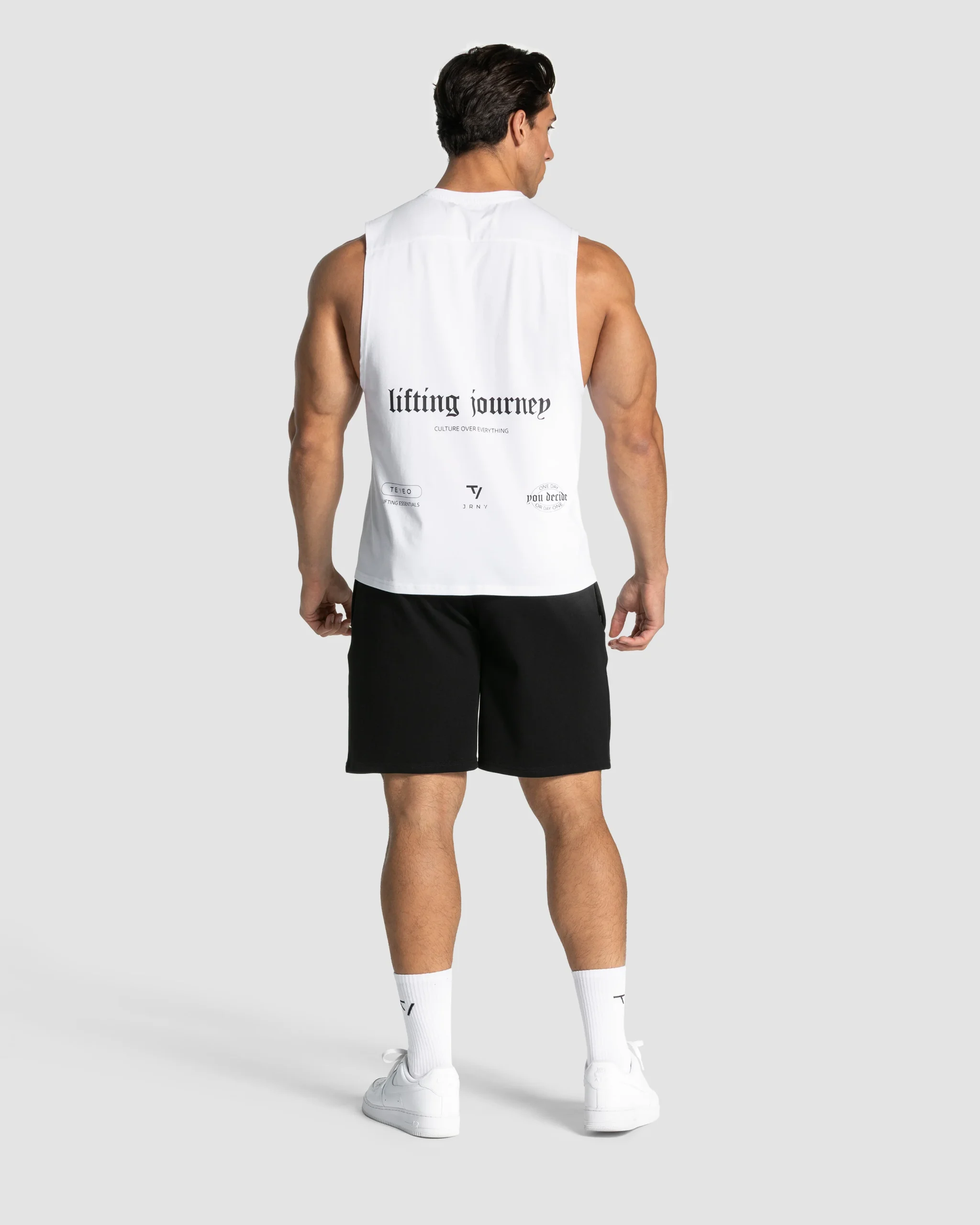 Das Lifting Journey Tank sorgt mit seinem Oversized Fit, den weiten Armausschnitten und den vorverlegten Nähten dafür, dass deine Muskeln richtig zur Geltung kommen. Das Design spricht die Sprache echter Dedication: Auf der Vorderseite überzeugt das TEVEO Lifting Journey Logo als klares Statement. Der Backprint setzt mit dem großflächigen Artwork ein kraftvolles Zeichen und wird durch drei charakteristische Prints am Saum abgerundet: TV Journey, TEVEO Lifting Essentials und « One Day or Day One – You Decide » – ein Mindset, das die gesamte Kollektion prägt. Das innenliegende TEVEO Logo-Necktape sowie die Passe auf der Rückseite runden den Look ab.