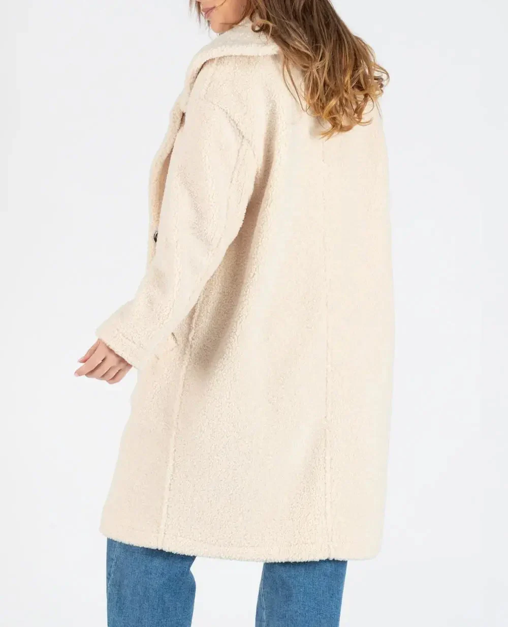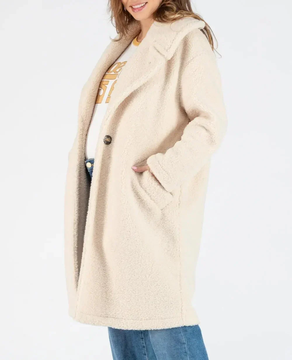 Le manteau long de maternité oversize Léonie Beige allie confort et élégance grâce à sa matière bouclette française et sa doublure polaire.