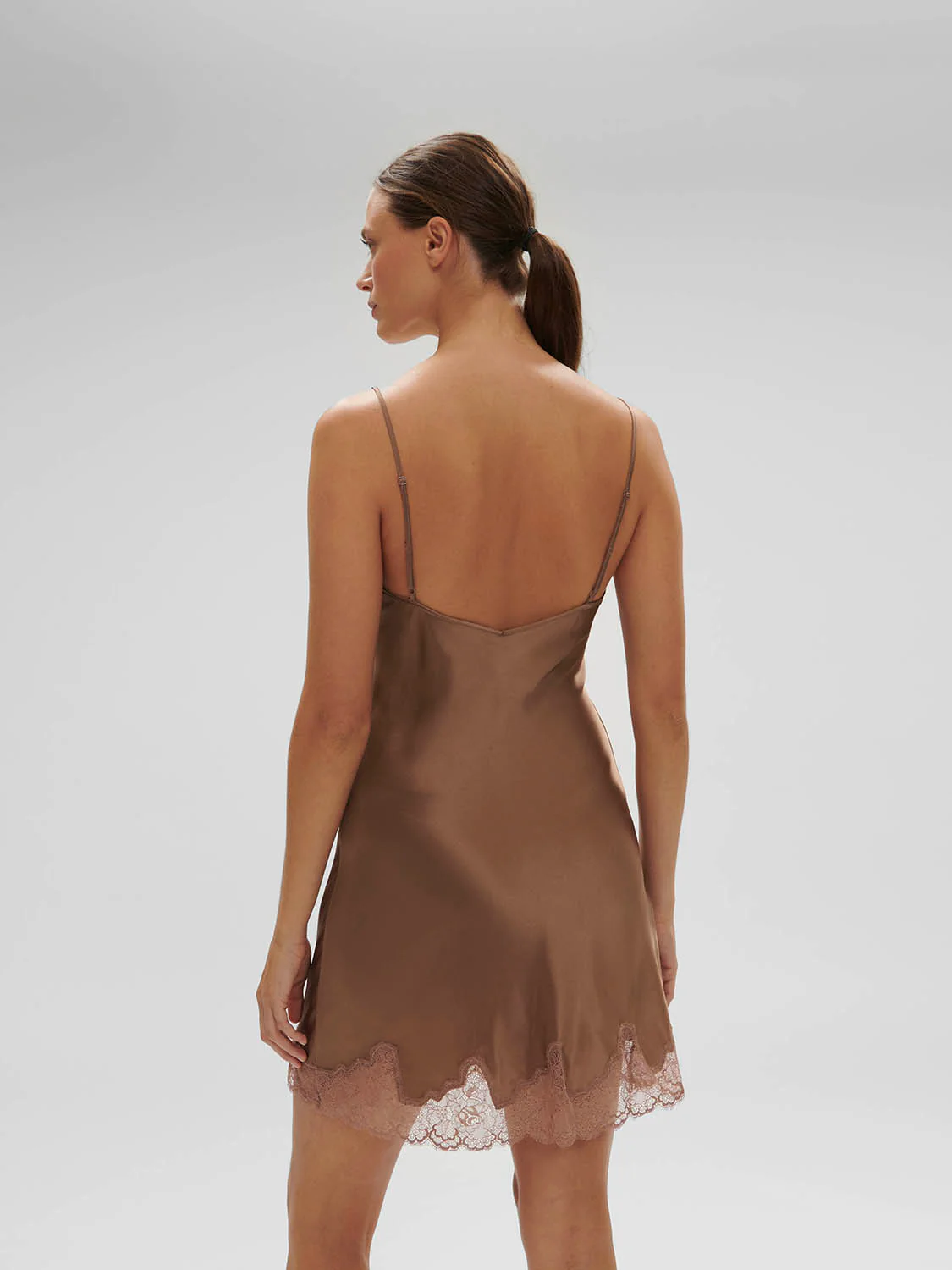 Soie légère réhaussée de dentelle raffinée pour une silhouette élégante.