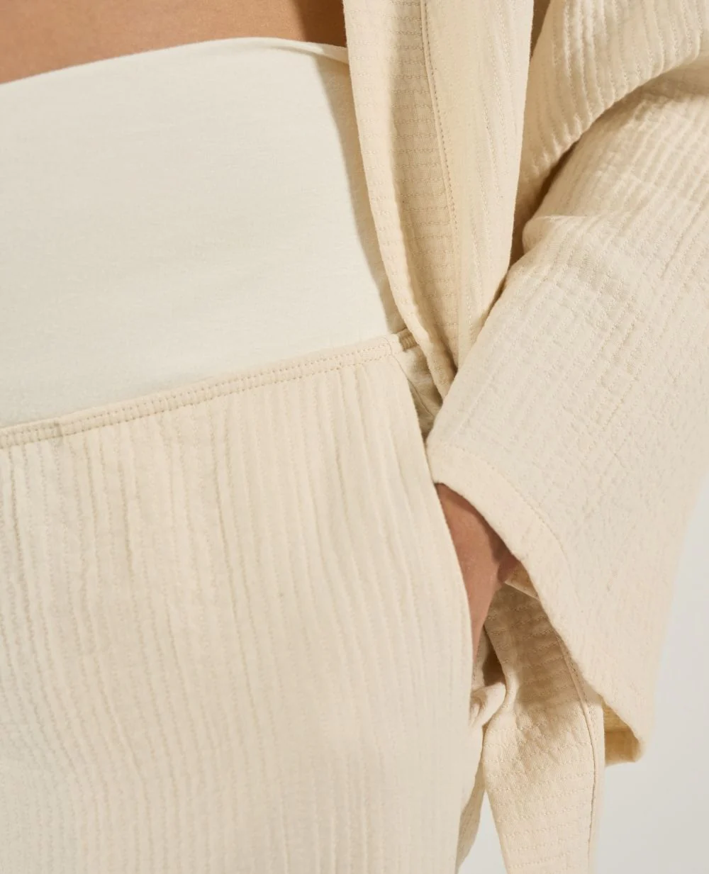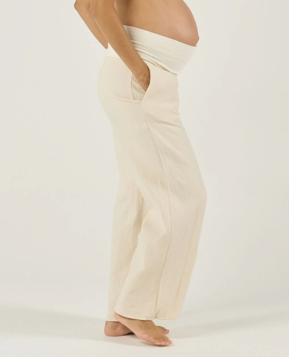 Découvrez le pantalon large Célia en coton bio texturé, parfait pour rester à la maison ou profiter d’un petit déjeuner en terrasse avec style et confort.