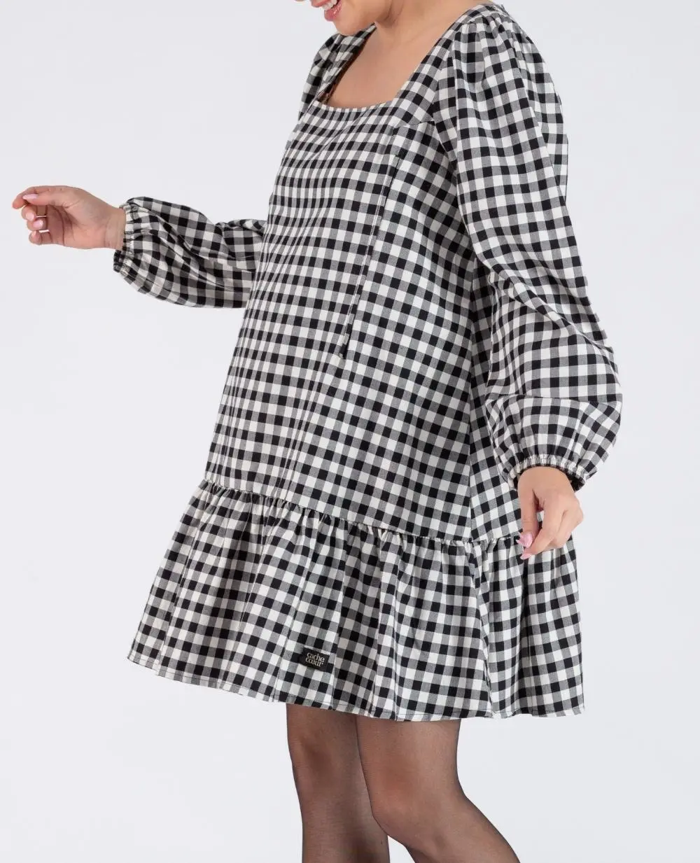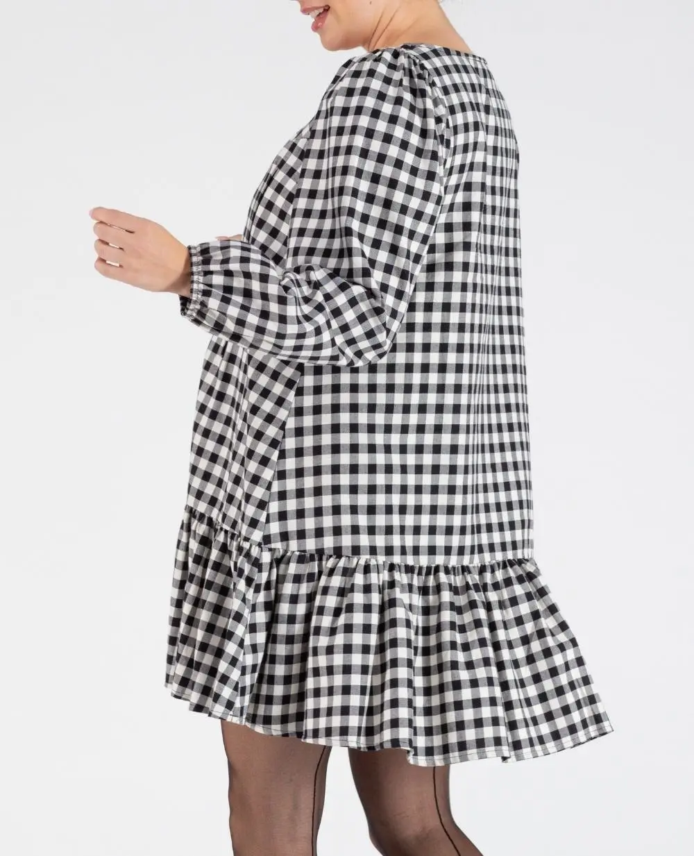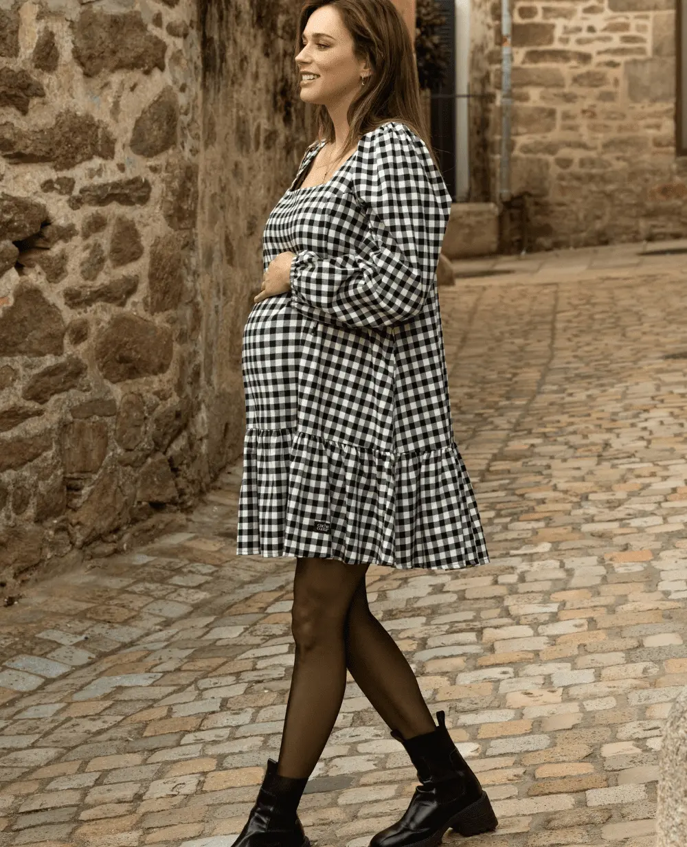 La robe courte de grossesse et d’allaitement Patti Noir/Blanc allie style et éco-responsabilité grâce à son coton 100% biologique certifié GOTS.