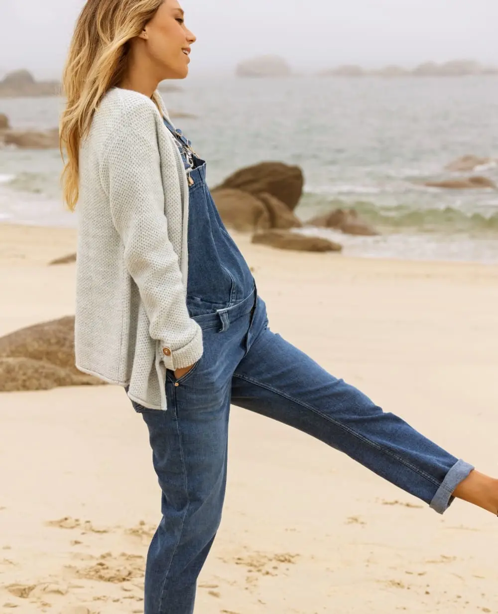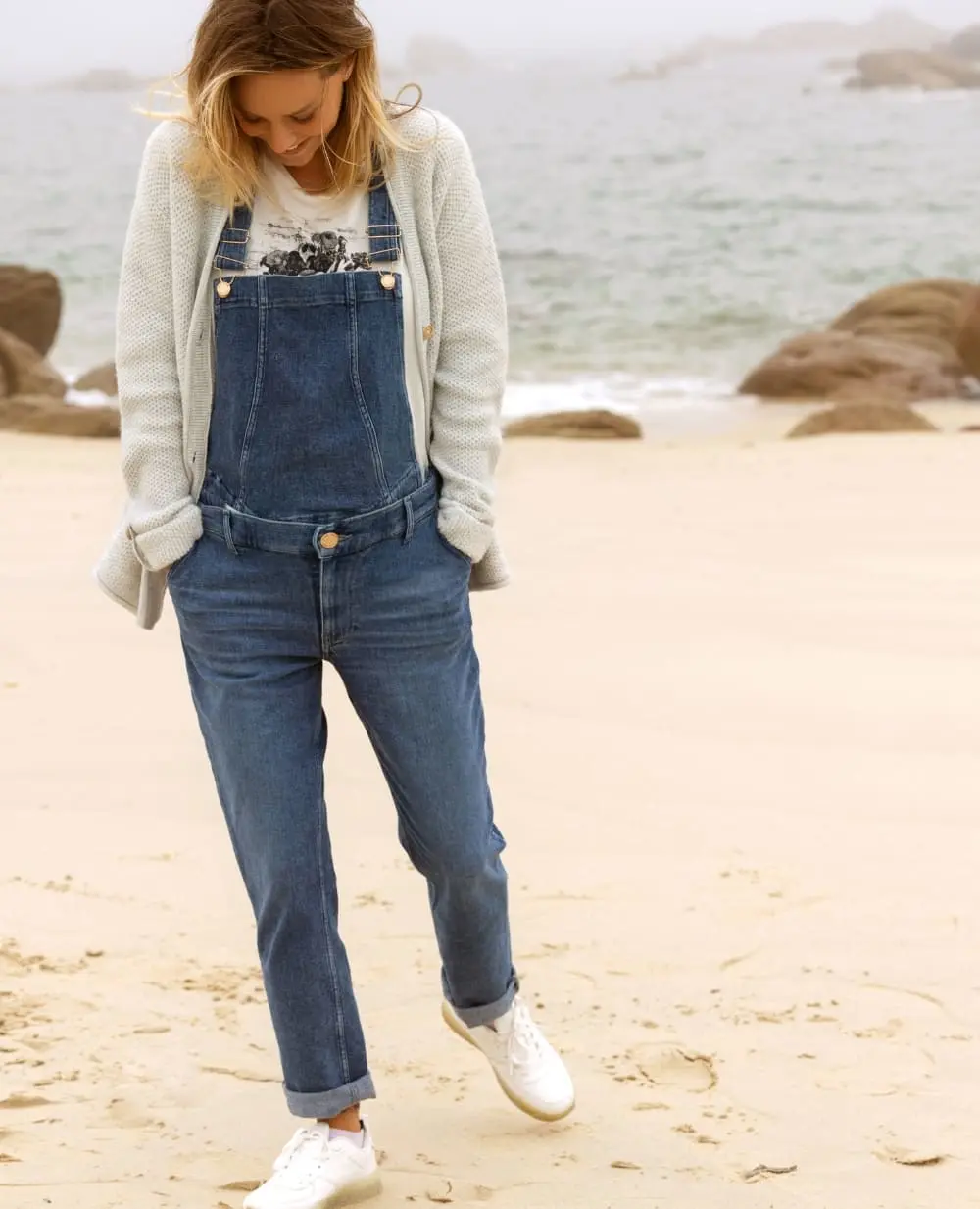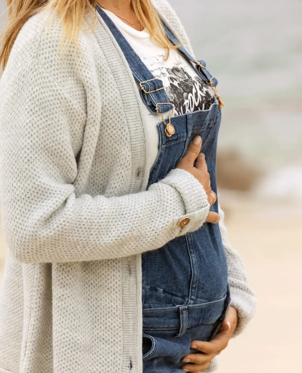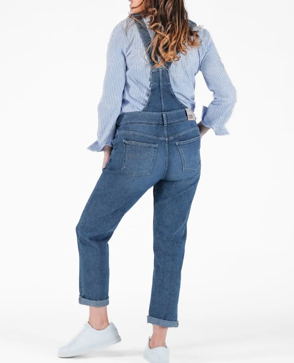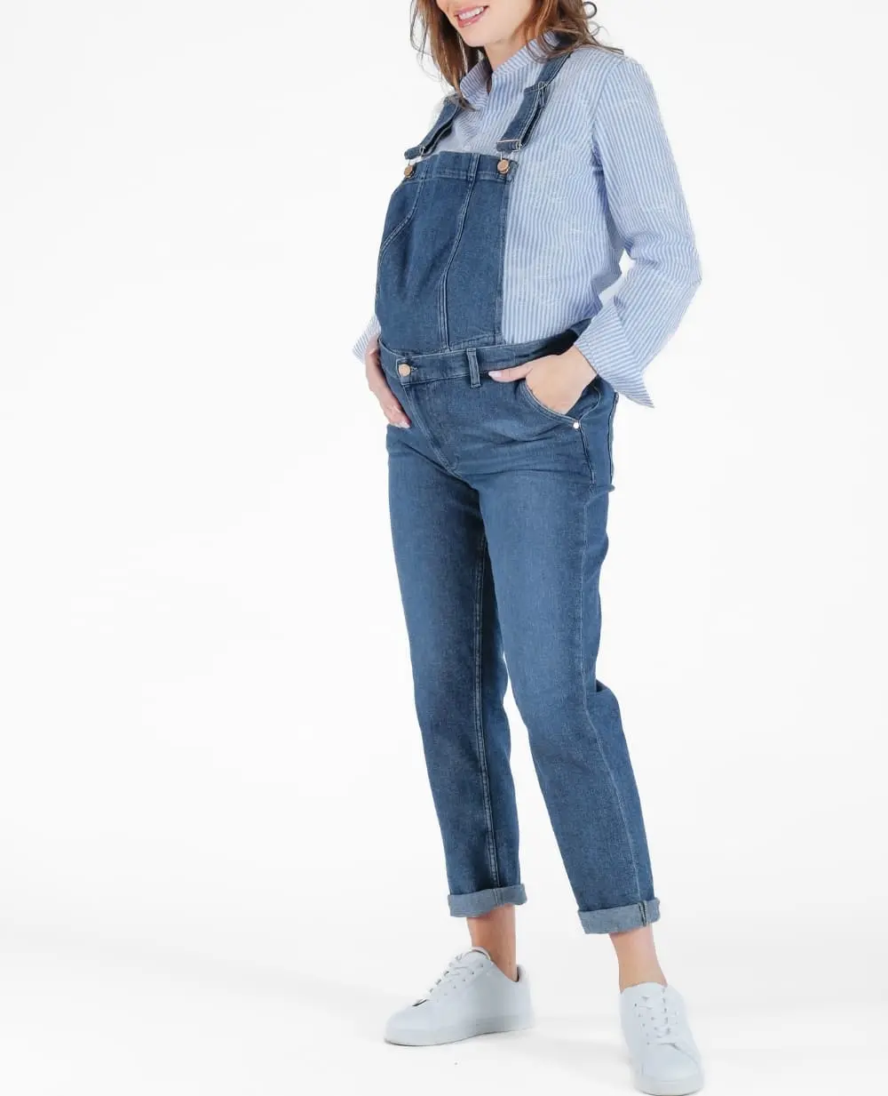 La salopette 2 en 1 de grossesse en jean Carrie Mid Blue Used allie style mom fit et éco-responsabilité grâce à son coton recyclé et son système Caméléon évolutif.