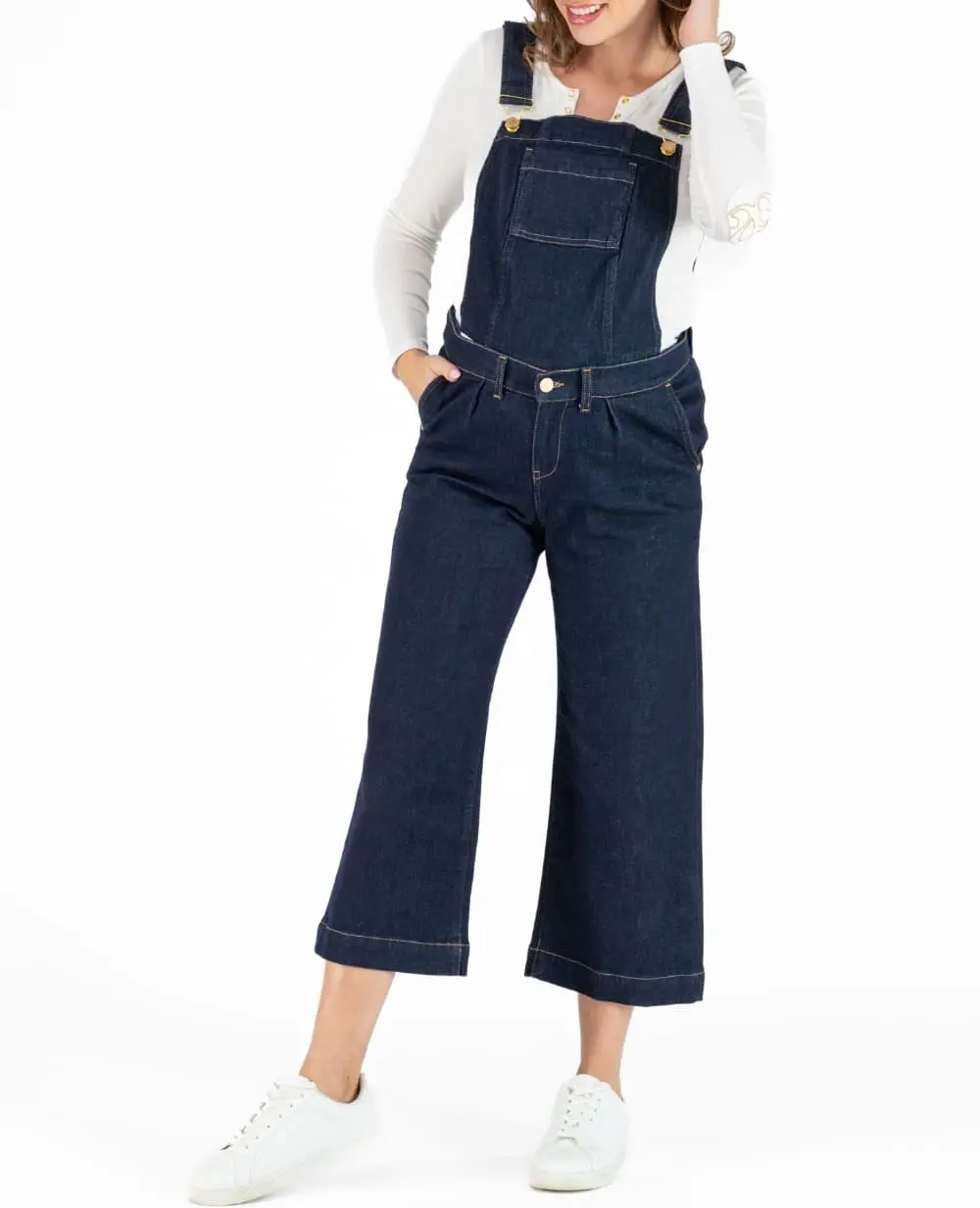 La salopette 2 en 1 de grossesse en jean Jill Brut allie style cropped wide leg et éco-responsabilité grâce à son coton 99% recyclé et son système Caméléon évolutif.