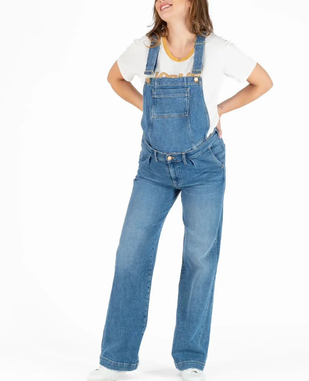 La salopette 2 en 1 de grossesse en jean Kelly Mid Blue allie style wide leg et éco-responsabilité grâce à son coton 99% recyclé et son système Caméléon.