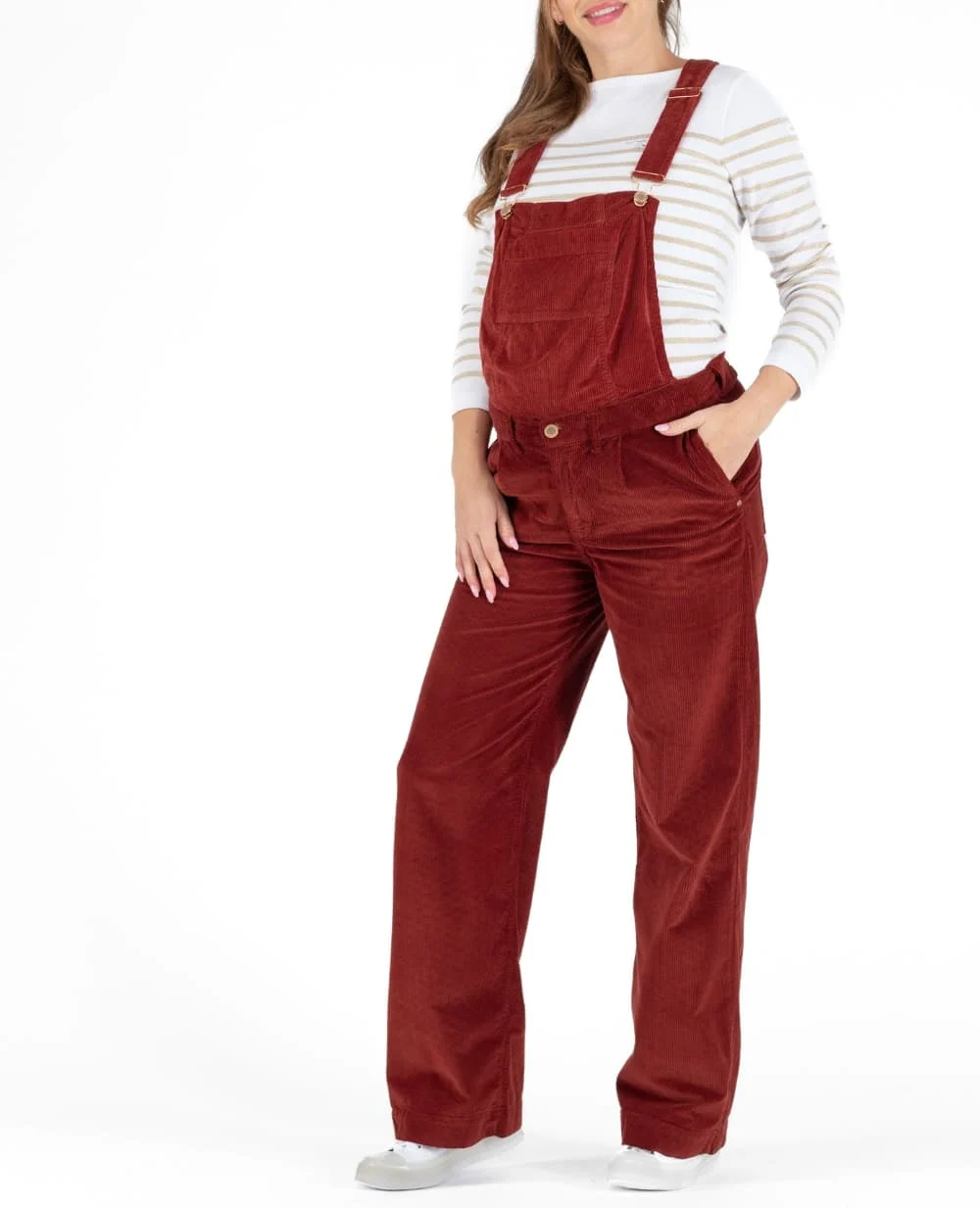 La salopette de grossesse en velours Clyde Havane allie douceur et élégance grâce à son velours côtelé et son système Caméléon évolutif.