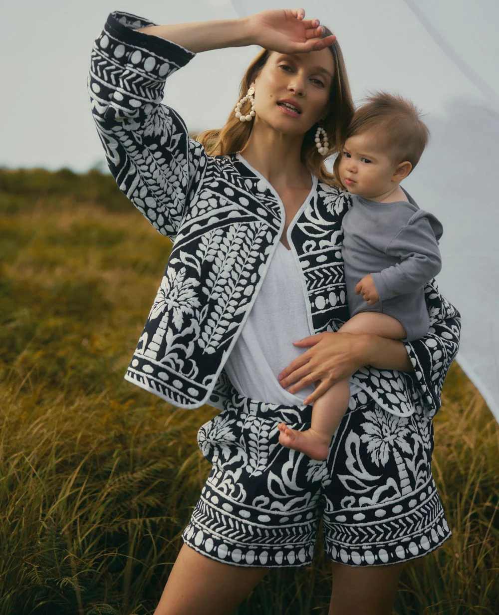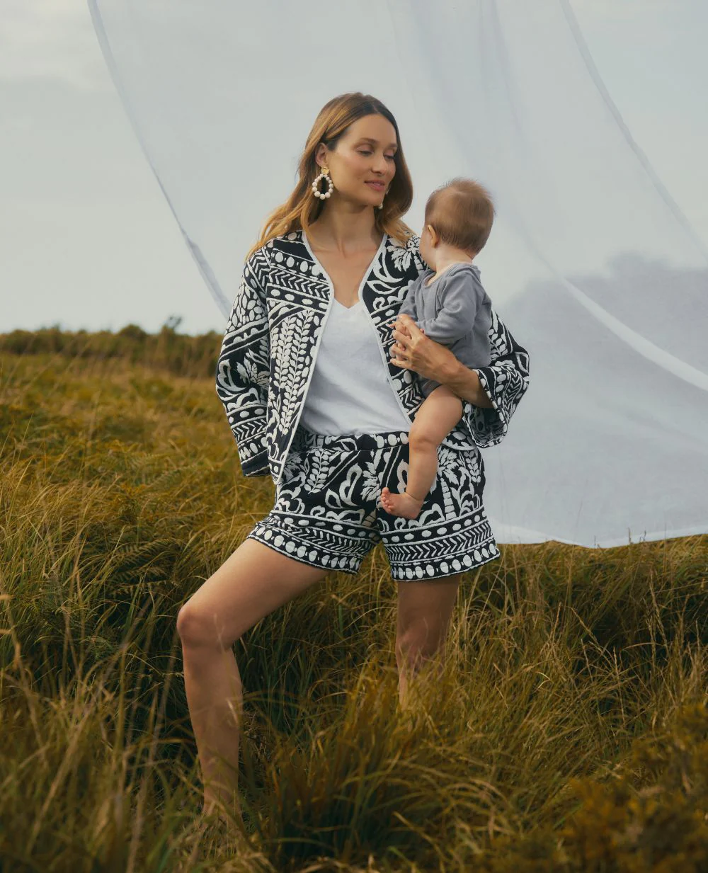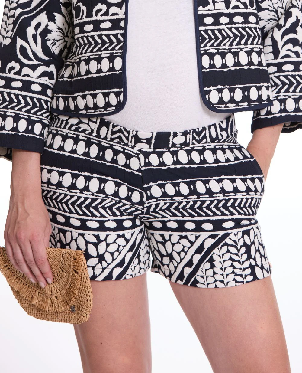 Le short de maternité Bali Multico allie élégance et praticité grâce à son motif ethnique et son jacquard français.