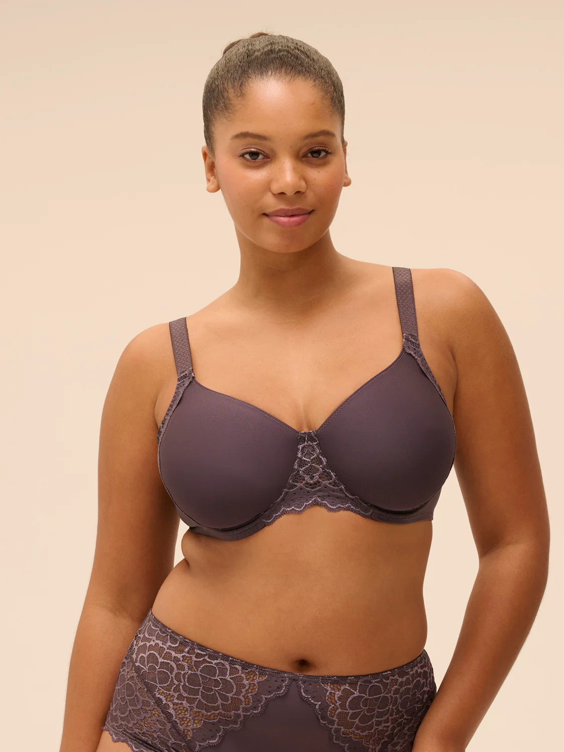 Soutien-gorge moulé en dentelle et maille avec armatures.