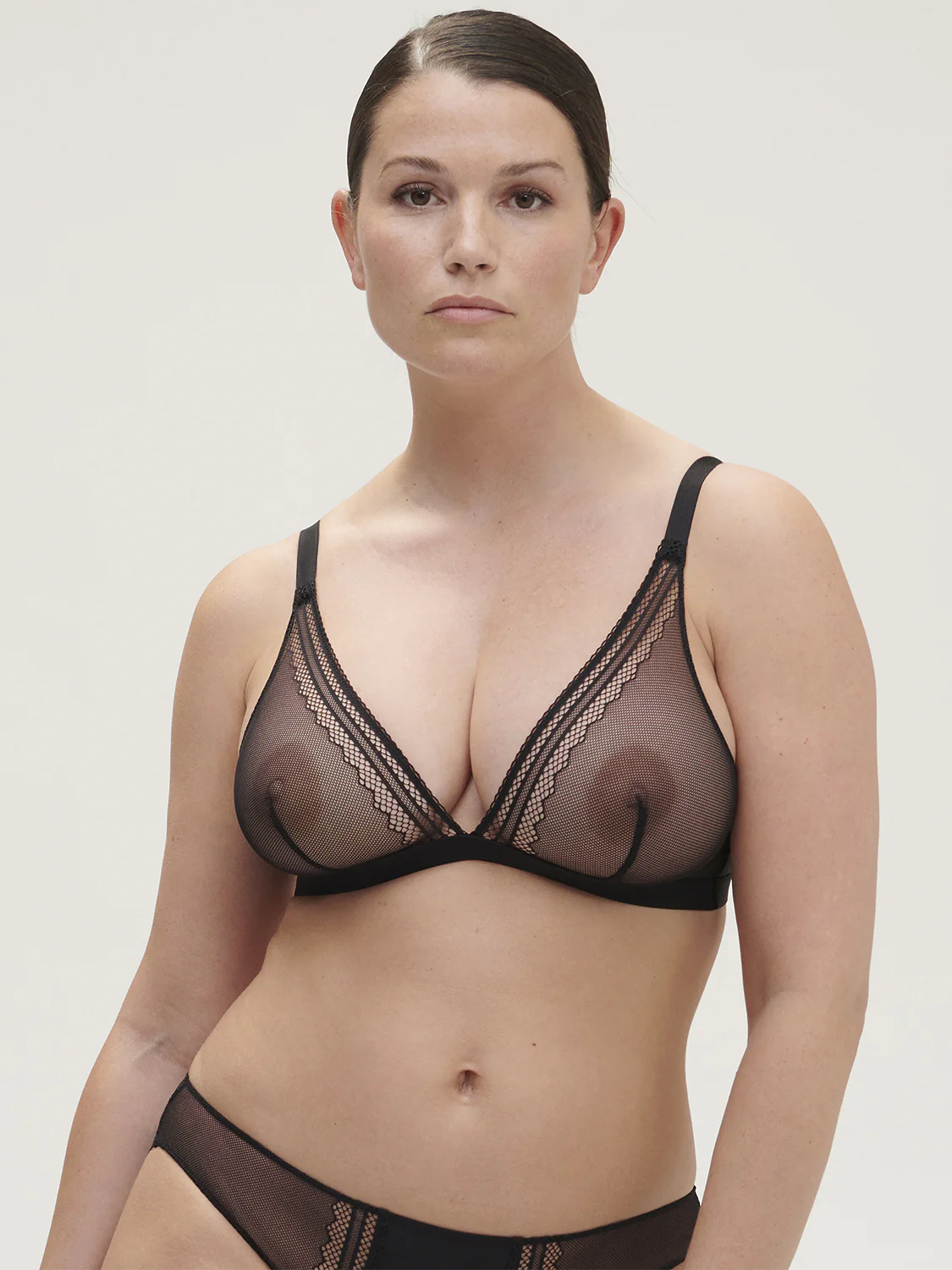 Soutien-gorge sans armatures triangle en dentelle résille recyclée et maille.