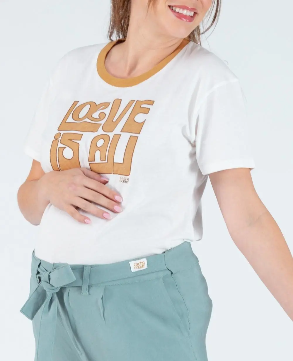 Le t-shirt de grossesse Love is All Ivoire allie style rétro et éco-responsabilité grâce à son coton 100% biologique certifié GOTS.