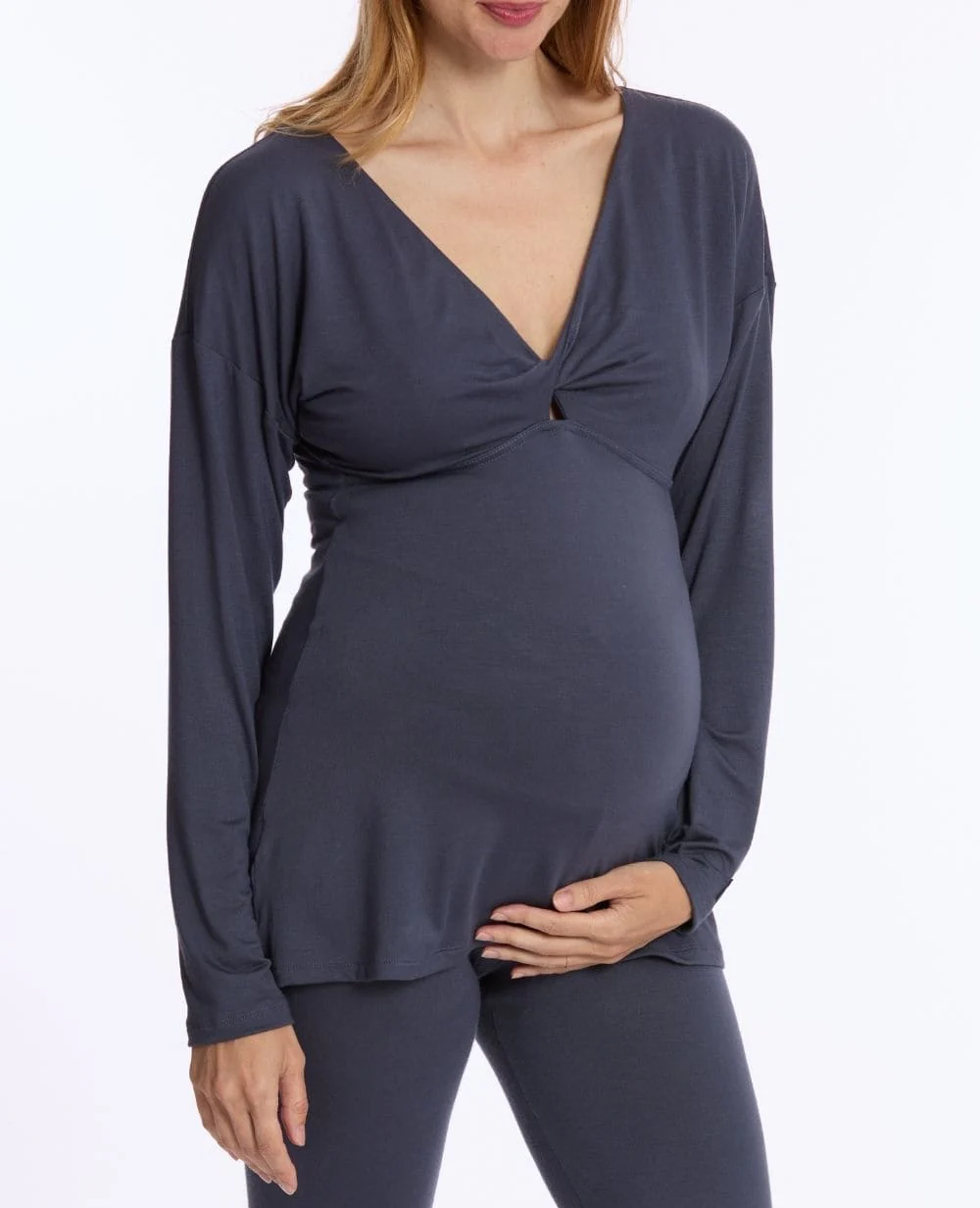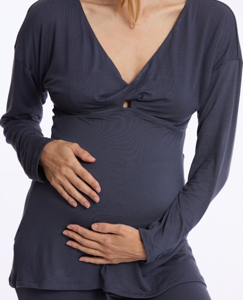 Le t-shirt manches longues de grossesse et d’allaitement Louna Bleu nuit allie douceur et confort grâce à sa viscose de bambou et son décolleté en V twisté.