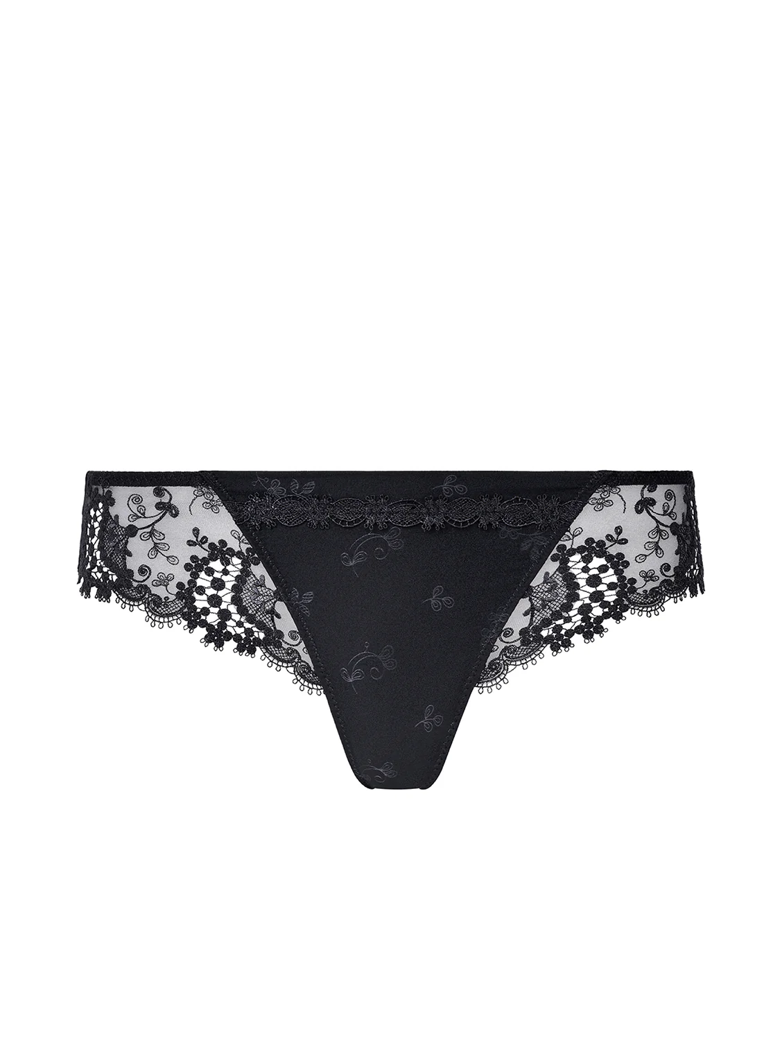 Ligne délicate en broderie florale et guipure. Raffinée et sophistiquée. Tanga en broderie, guipure et satin Jacquard. • Satin opaque sur le milieu devant pour plus d’opacité. • Fond doublé 100% coton. Référence : 12B710.015