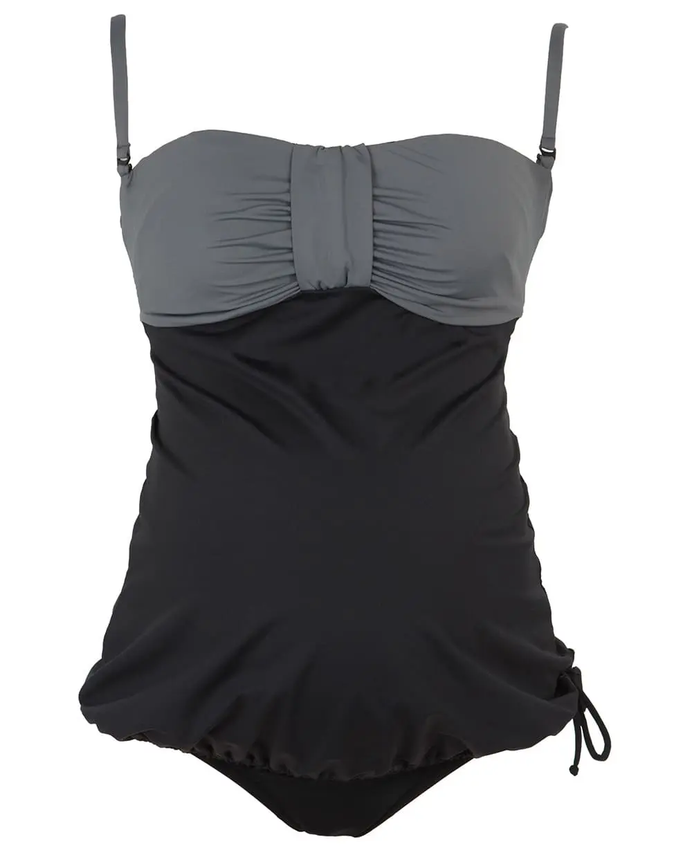 Le tankini de grossesse EDEN Noir allie confort absolu et élégance grâce à sa coupe effet boule sophistiquée et son décolleté bandeau.